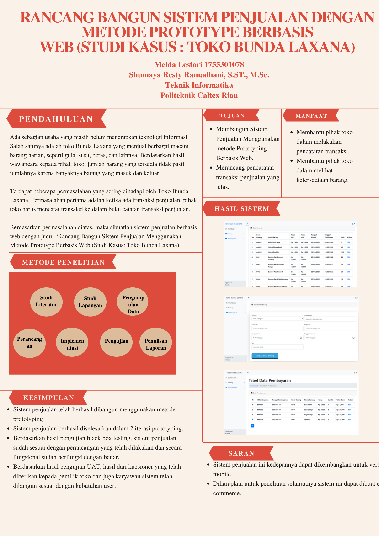 Penerapan teknologi informasi masih belum merata salah satunya adalah Toko Bunda Laxana yang menjual berbagai macam barang harian, seperti gula, susu, beras, dan lainnya. Beberapa permasalahan yang sering dihadapi oleh Toko Bunda Laxana yaitu ketika ada transaksi penjualan, pihak toko harus mencatat transaksi ke dalam buku catatan transaksi penjualan. Resiko yang dihadapi adalah kesalahan dalam pengolahan data dan sering terjadinya kehilangan bukti transaksi. Akibatnya, pihak toko tidak bisa menghitung total penjualan dan mengalami kerugian pada toko. Permasalahan kedua adalah ketika pelanggan yang ingin membeli barang dengan jumlah yang banyak, pihak toko harus memastikan jumlah ketersediaan barang terlebih dahulu di gudang. Pihak toko belum mengetahui apakah ketersediaan barang memadai. Berdasarkan permasalahan diatas, maka penelitian ini mengusulkan untuk membuat sebuah sistem penjualan berbasis web dengan judul Rancang Bangun Sistem Penjualan Menggunakan Metode Prototyping. Sistem ini dirancang menggunakan bahasa pemograman PHP dan MYSQL sebagai DBMS nya. Pengujian pada sistem ini menggunakan pengujian black box) dengan hasil disimpulkan bahwa secara fungsionalitas sistem penjualan telah berhasil secara keseluruhan. Pada pengujian User Accaptance Test (UAT) telah dilakukan pengujian fungsionalitas sistem kepada pemilik toko dan karyawan, dan berdasarkan hasil pengujian secara keseluruhan sistem telah berfungsi dengan baik secara fungsional.