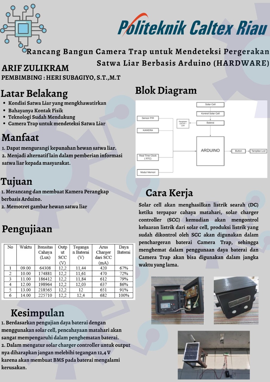Kamera trap merupakan kamera yang digunakan untuk memantau dan mengambil gambar satwa liar. Kamera ini biasanya digunakan pada wilayah yang terpencil atau di hutan dan beroperasi baik siang ataupun malam. Pada Proyek Akhir ini dilakukan rancang bangun kamera trap dilengkapi panel surya dan LED infrared. Sebagai pengendali utama adalah mikrokontroler Arduino. Solar cell digunakan sebagai sumber daya tambahan sehingga baterai lebih tahan lama. Led infrared berfungsi sebagai sumber pencahayaan kamera pada kondisi malam hari. Hasil pengujian menunjukkan bahwa penggunaan solar cell dapat membantu penghematan penggunaan daya pada baterai. Sedangkan LED infrared memungkinkan kamera dapat memotret gambar pada malam hari atau kondisi tidak adanya pencahayaan.