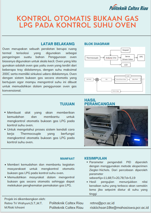 Oven merupakan sebuah peralatan berupa ruang termal terisolasi yang digunakan sebagai pengeringan suatu bahan. Pengeringan menggunakan oven lebih cepat dibandingkan dengan pengeringan menggunakan panas matahari. Akan tetapi, kecepatan pengeringan tergantung dari bahan yang dikeringkan. Penggunaan oven biasanya digunakan untuk skala kecil. Oven yang kita gunakan adalah oven gas yaitu oven yang terdiri dari beberapa tray didalamnya, dengan suhu maksimal 2000C serta memiliki sirkulasi udara didalamnya. Oven dengan sistem bukaan gas secara otomatis yang bertujuan agar mampu mengontrol suhu ini dibuat untuk memudahkan dalam penggunaan oven gas konvensional. Dengan ditambahkannya pengendali PID pada prosesnya yang bertujuan agar menjaga suhu dalam keadaan stabil.Parameter pengendali PID diperoleh dengan menggunakan metode eksperimen Ziegler-Nichols tipe 1.dengan parameter Kp=11,68; Ti=41,58; Td=10,39. Hasil pengujian kinerja sistem kendali diperoleh respon rise time 1 menit atau 60 detik, settling time 3 menit atau 180 detik, dan tidak terdapat overshoot. Pada percobaan didapatkan hasil yang bagus dimana diperoleh suhu yang stabil dan cepat untuk mendapatkan setpoint, contohnya di suhu 100c membutuhkan waktu 3 menit 41 detik untuk mencapai setpoint.