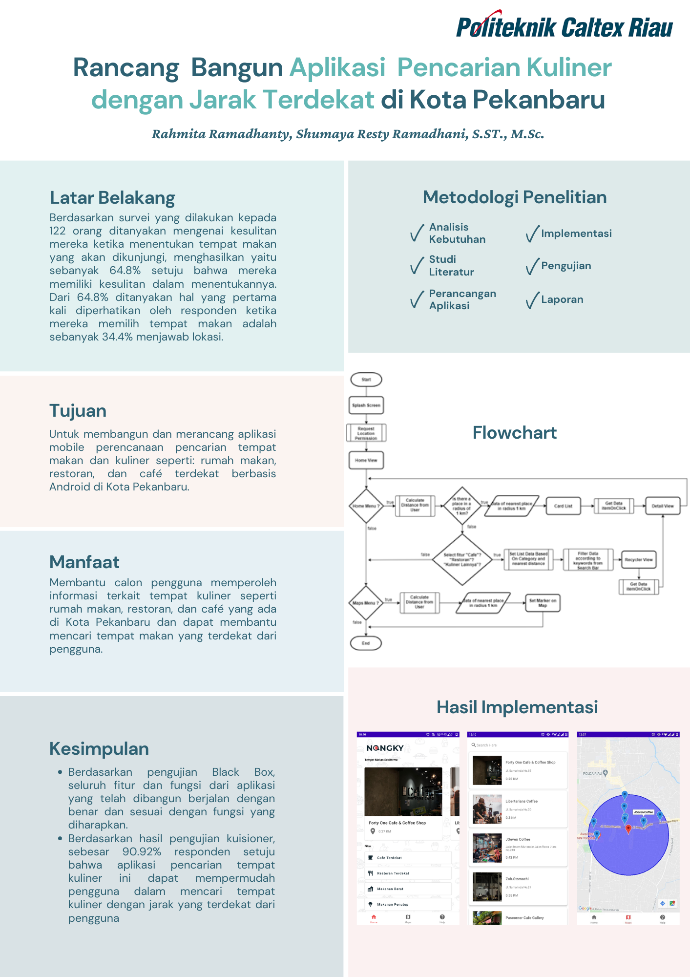 Makanan merupakan salah satu kebutuhan yang penting bagi kehidupan manusia dan akan semakin meningkat seiring dengan pertumbuhan jumlah penduduk yang semakin banyak. Di Kota Pekanbaru pertumbuhan dan perkembangan kuliner seperti rumah makan, restoran, dan café saat ini semakin pesat. Tempat makan yang semakin banyak dan jenis-jenis makanan yang ditawarkan semakin beragam, membuat orang-orang kebingungan dan membutuhkan waktu yang lama untuk memutuskan pilihan tempat makan. Berdasarkan masalah tersebut, maka dirancanglah sebuah aplikasi pencarian kuliner dengan jarak terdekat di Kota Pekanbaru yang berfokus pada tempat makan dengan fitur utama yaitu pencarian tempat makan dan hasil keluaran aplikasi adalah titik tempat makan terdekat beserta informasi dari tempat makan tersebut. Pengembangan aplikasi ini menggunakan algoritma haversine untuk mencari titik terdekat dan berbasis Android dengan mengimplementasikan arsitektur Model View ViewModel (MVVM). Aplikasi ini memanfaatkan layanan Google Maps API untuk menampilkan peta lokasi dan titik lokasi berdasarkan koordinat latitude dan longitude serta fitur untuk navigasi, sedangkan untuk data titik koordinat lokasi tempat makan berasal dari data di REST API. Pengembangan aplikasi ini diharapkan dapat membantu pengguna mendapatkan informasi yang dibutuhkan mengenai tempat makan atau tempat kuliner di Kota Pekanbaru. Berdasarkan hasil pengujian yang dilakukan terhadap aplikasi yang dibangun menggunakan black box, didapatkan hasil bahwa aplikasi sudah 100% berhasil dibangun sesuai yang diharapkan. Selanjutnya pengujian kuesioner, sebesar 90.92% setuju fitur aplikasi telah berjalan sesuai dengan fungsinya dan bermanfaat bagi pengguna dalam mencari tempat kuliner.