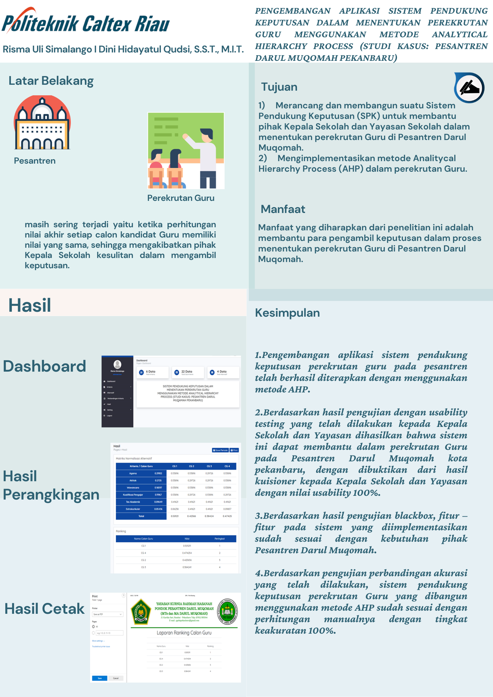 Pesantren Darul Muqomah merupakan sebuah bentuk perwujudan dalam mendidik generasi muda Islam yang bertakwa. Pesantren Darul Muqomah yang terdiri dari jenjang pendidikan Madrasah Tsanawiyah (MTS) dan Madrasah Aliyah (MA). Berdasarkan hasil wawancara dengan pihak Kepala Sekolah Bapak Elpisman, perekrutan Guru di Pesantren Darul Muqomah diadakan setiap tahunnya. Seleksi perekrutan Guru dilakukan dengan enam kriteria yaitu agama, akhlak, wawancara, kualifikasi pengajar, tes akademik, dan extrakurikuler. Selama ini, dalam perekrutan Guru menimbulkan masalah yang masih sering terjadi yaitu ketika perhitungan nilai akhir setiap calon kandidat Guru memiliki nilai yang sama, sehingga mengakibatkan pihak Kepala Sekolah kesulitan dalam mengambil keputusan. Untuk membantu proses seleksi perekrutan Guru, maka dibutuhkan sebuah sistem pengambilan keputusan. Dengan dibangunlah sistem pendukung keputusan perekrutan Guru menggunakan metode Analytical Hierarchy Process. Untuk pengembangan proyek akhir disarankan menambahkan fitur untuk calon guru pada sistem dan menginputkan biodatanya sendiri serta mengupload document kualifikasi pengajar agar lebih praktis. Berdasarkan pengujian usability pada pihak Kepala Sekolah dan Yayasan bahwa sistem dapat membantu dalam perekrutan Guru dengan hasil presentase 100%. Berdasarkan pengujian blackcox fitur-fitur yang diimplementasikan sudah sesuai dengan kebutuhan pihak Pesantren Darul Muqomah. Selain itu berdasarkan pengujian akurasi perhitungan sistem dan perhitungan manual dapat disimpulkan bahwa perhitungan sistem yang dibangun sudah sama dengan perhitungan manual dengan tingkat akurasi 100%.