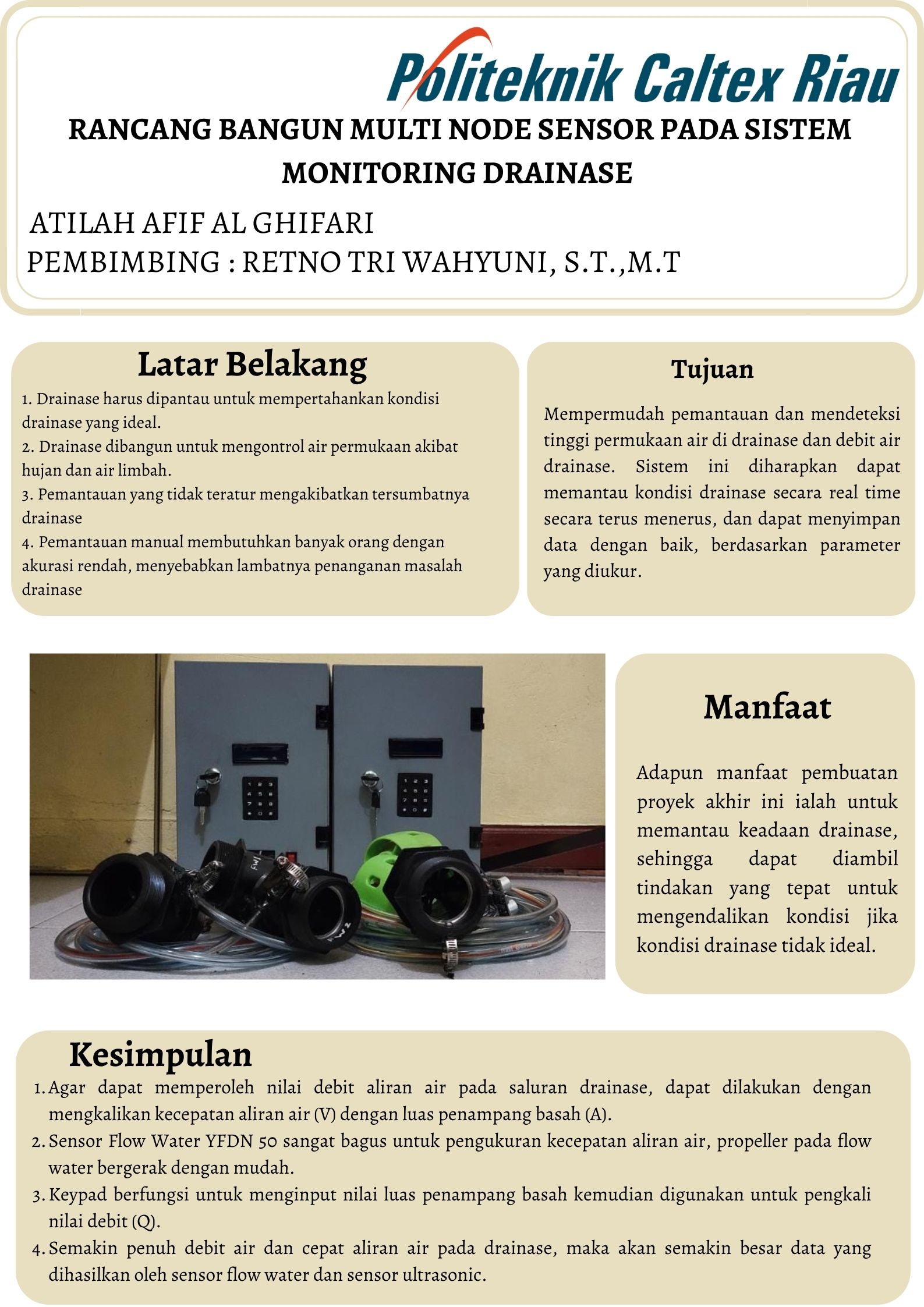 Drainase didefinisikan sebagai infrastruktur untuk mengeringkan tanah dari air yang berlebih dan tidak digunakan; air hujan dan air limbah. Kondisi drainase harus dipantau untuk mempertahankan fungsinya yang tepat. Nyatanya, tidak semua wilayah memiliki tim pemantau drainase. Ini mengarah pada pemantauan kondisi drainase yang tidak teratur. Pemantauan yang tidak teratur berkontribusi pada tersumbatnya drainase yang berimplikasi pada pendangkalan yang memicu banjir di lingkungan sekitar. Pemantauan manual juga tidak efisien. Dibutuhkan banyak orang yang berdedikasi yang hanya mampu merekam laporan terbatas dengan akurasi rendah. Kelemahan tersebut menyebabkan lambatnya penanganan masalah drainase. Hal inilah yang mendorong penulis untuk membuat alat perancangan sistem drainase yang dimaksudkan untuk memantau kondisi di beberapa titik dalam sistem drainase dengan menggunakan multi node sensor. Beberapa node sensor ditempatkan di beberapa titik yang ditentukan untuk dihubungkan satu sama lain. Data yang sudah direkam akan disimpan ke dalam database. Parameter pemantauan adalah tinggi muka air di drainase, debit air. Sistem ini diharapkan dapat memantau kondisi drainase secara real time secara terus menerus, dan dapat menyimpan data dengan baik.