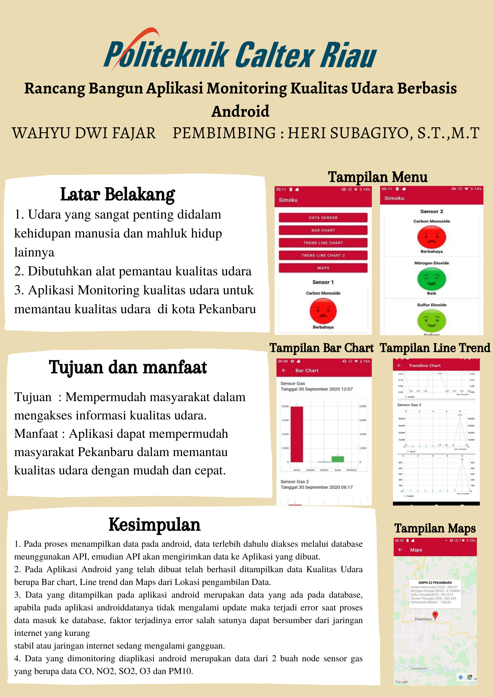 Provinsi riau merupakan wilayah yang hampir setiap tahun nya menjadi salah satu wilayah langganan dengan kualitas udara yang buruk yang diakibatkan oleh bencana kebakaran hutan dan lahan. Akibatnya kualitas udara menurun dan tidak sehat bagi manusia. Oleh karena itu, suatu sistem monitoring kualitas udara diperlukan agar manusia bisa memantau kondisi kualitas udara dan melakukan tindakan pencegahan atau antisipasi. Dalam proyek akhir ini dibuat rancang bangun aplikasi monitoring kualitas udara berbasis android. Proyek akhir ini merupakan pengembangan proyek akhir sebelumnya yang berbasis website. Aplikasi monitoring kualitas udara adalah sistem yang digunakan untuk mengetahui indeks kualitas udara di suatu kawasan/wilayah. Dalam penelitian proyek akhir ini dilakukan pengembangan aplikasi android. Aplikasi yang dibangun melakukan request dan mengambil data parameter udara yang telah ada di database server menggunakan jembatan API. Data selanjutnya ditampilkan di aplikasi. Aplikasi ini akan dilengkapi untuk tampilan data dalam bentuk peta lokasi sensor, grafik batang, dan trendline data. Hasil pengujian menunjukkan bahwa data kualitas udara telah dapat diterima, disimpan, dan ditampilkan melalui Aplikasi. Dengan demikian pemantauan kualitas udara lebih mudah dilakukan tanpa perlu membuka web lagi.