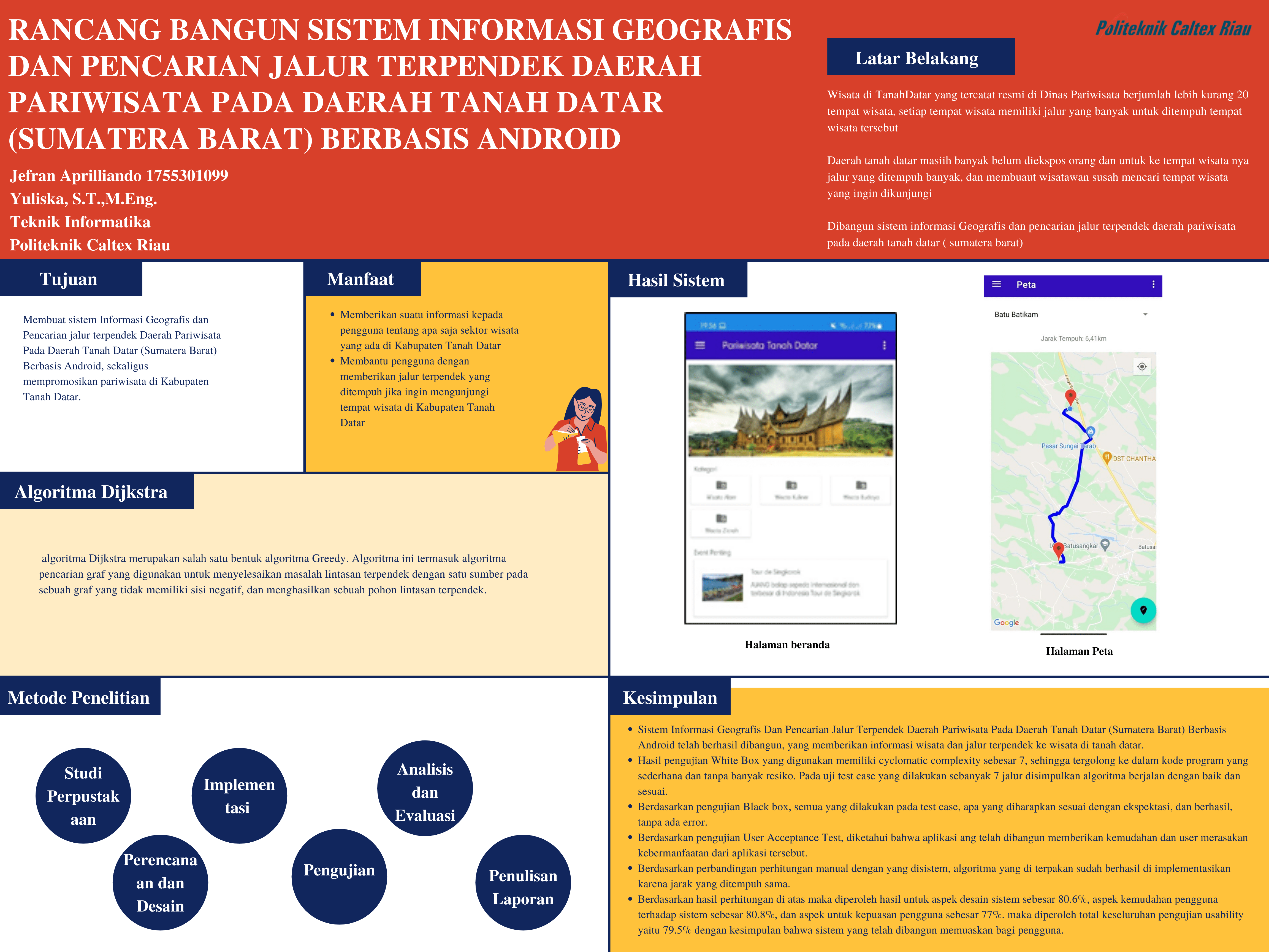 Aplikasi sistem informasi pariwisata dan pencarian jalur terpendek merupakan sistem yang digunakan untuk mencari informasi tentang wisata dan jalur terpendek menuju tempat wisata di Kabupaten Tanah Datar. Untuk menemukan tempat wisata, wisatawan biasanya mencari aplikasi mesin pencari atau peta wisata sehingga memakan waktu yang lama. Oleh karena itu untuk memberikan kemudahan maka dibuatlah sebuah Sistem Informasi Geografis. Sistem ini dikembangkan menggunakan algoritma Dijkstra dan berbasis android. Pengujian yang digunakan untuk penelitian ini adalah pengujian Black Box, White Box, Dan User Acceptance Test. Berdasarkan hasil pengujian black box diperoleh bahwa aplikasi sudah memiliki fitur yang dibutuhkan oleh pengguna. Dan untuk pengujian white box didapatkan bahwa kode program memiliki cyclomatic complexity sebesar 7, sehingga tergolong ke dalam kode program yang sederhana dan tanpa banyak resiko. Pada uji test case yang dilakukan sebanyak 7 jalur disimpulkan algoritma berjalan dengan baik dan sesuai. Sedangkan hasil dari pengujian User acceptance Test diperoleh hasil bahwa aplikasi yang telah dibangun memberikan kemudahan dan user merasakan kebermanfaatan dari aplikasi tersebut.