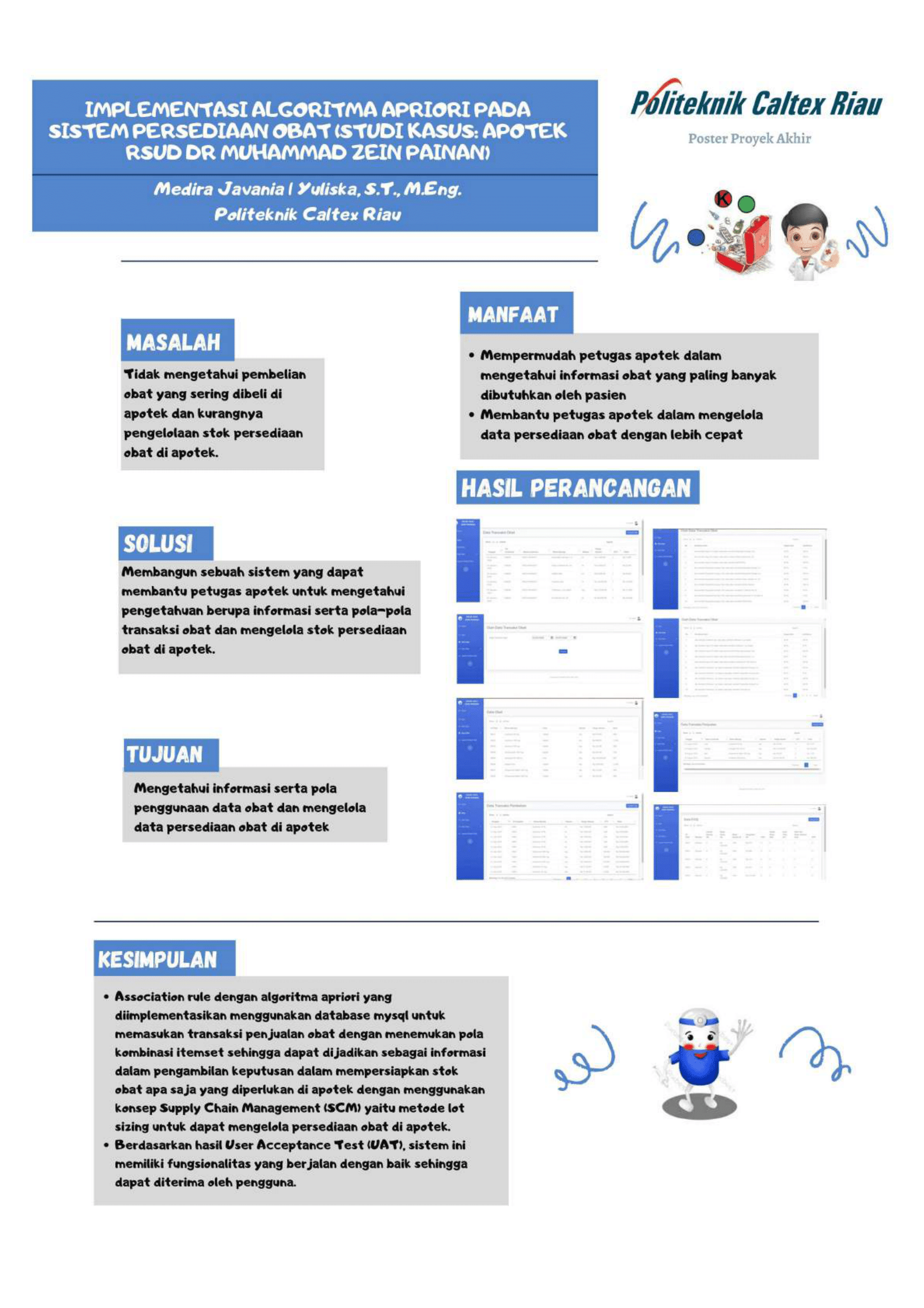 Apotek (RSUD) Dr. Muhammad Zein Painan setiap hari melakukan kegiatan operasional untuk melayani pasien Badan Penyelenggaraan Jaminan Sosial (BPJS) dan pasien umum yang ada di rumah sakit. Kegiatan operasional yang dilakukan setiap hari menyebabkan data transaksi pembelian obat menjadi bertambah banyak. Data transaksi obat tersebut tidak diolah dan dianalisis sehingga tidak menghasilkan informasi mengenai obat yang sering dibeli oleh pasien dan jumlah stok obat yang harus tersedia di apotek. Dari data transaksi obat yang didapatkan maka dapat dilakukan pengolahan data untuk mendapatkan informasi mengenai pola obat yang sering dibeli dan jumlah stok obat yang harus tersedia guna untuk meningkatkan pelayanan di apotek. Dengan adanya masalah tersebut maka dapat digunakan konsep Supply Chain Management (SCM) dengan menggunakan metode lot sizing dalam mengelola stok obat dan menerapkan association rule (aturan asosiasi) untuk melihat kebiasaan pasien dalam membeli obat secara bersamaan dan menggunakan algoritma apriori untuk melakukan proses pengolahan data dengan jumlah yang besar. Pembangunan sistem ini menggunakan bahasa pemrograman php dengan framework codeigniter dan database mysql. Semua fungsionalitas sistem telah terpenuhi dengan dilakukannya pengujian User Acceptance Test (UAT) yang mendapatkan 13 butir uji yang berjalan dengan baik.