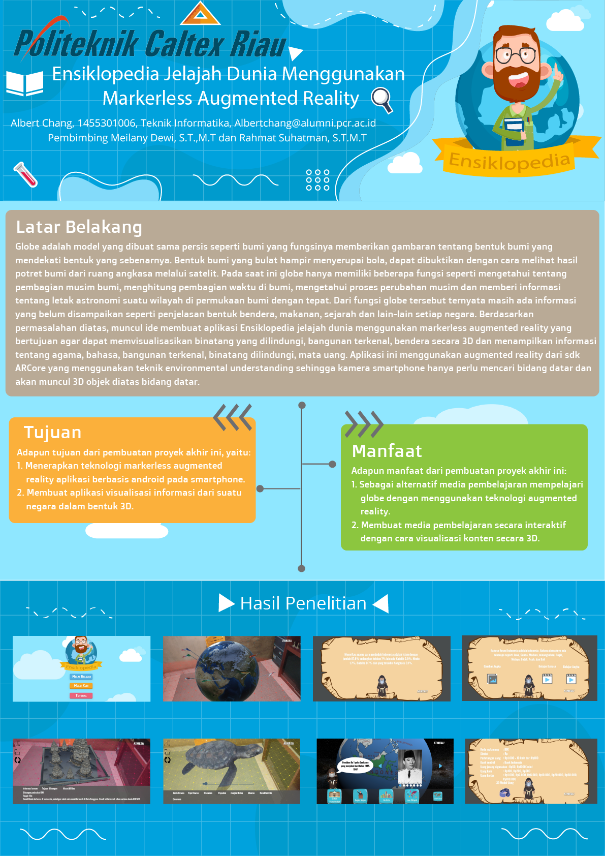 Negara Indonesia, sistem pembelajaran pada sekolah dasar telah mulai mempelajari bentuk bumi dengan media globe. Pada saat ini globe hanya memiliki beberapa fungsi seperti mengetahui tentang pembagian musim bumi, menghitung pembagian waktu di bumi, mengetahui proses perubahan musim dan memberi informasi tentang letak astronomi suatu wilayah di permukaan bumi dengan tepat. Dari fungsi globe tersebut ternyata masih ada informasi yang belum disampaikan. Hal ini menyebakan kurangnya sarana informasi detail, media pembelajaran menggunakan globe yang masih monoton dan kurang minat belajar menjadi bosan. Untuk menghadapi masalah tersebut dibangun aplikasi Ensiklopedia jelajah dunia menggunakan markerless augmented reality. Pada aplikasi ini bertujuan agar dapat memvisualisasikan binatang yang dilindungi, bangunan terkenal, bendera secara 3D dan menampilkan informasi tentang agama, bahasa, bangunan terkenal, binatang dilindungi, mata uang. Aplikasi ini menggunakan teknik environmental understanding sehingga hanya perlu mencari bidang datar dan akan muncul 3D objek diatas bidang datar. Untuk menggunakan aplikasi ini minimal jarak 40cm dan jarak optimal pemakaian adalah 100cm. Berdasarkan pengujian usability dengan memberikan kuesioner kepada 90 responden diperoleh 83,29% aplikasi ini dapat menjadi alternatif media pembelajaran mempelajari globe dengan menggunakan teknologi augmeted reality.