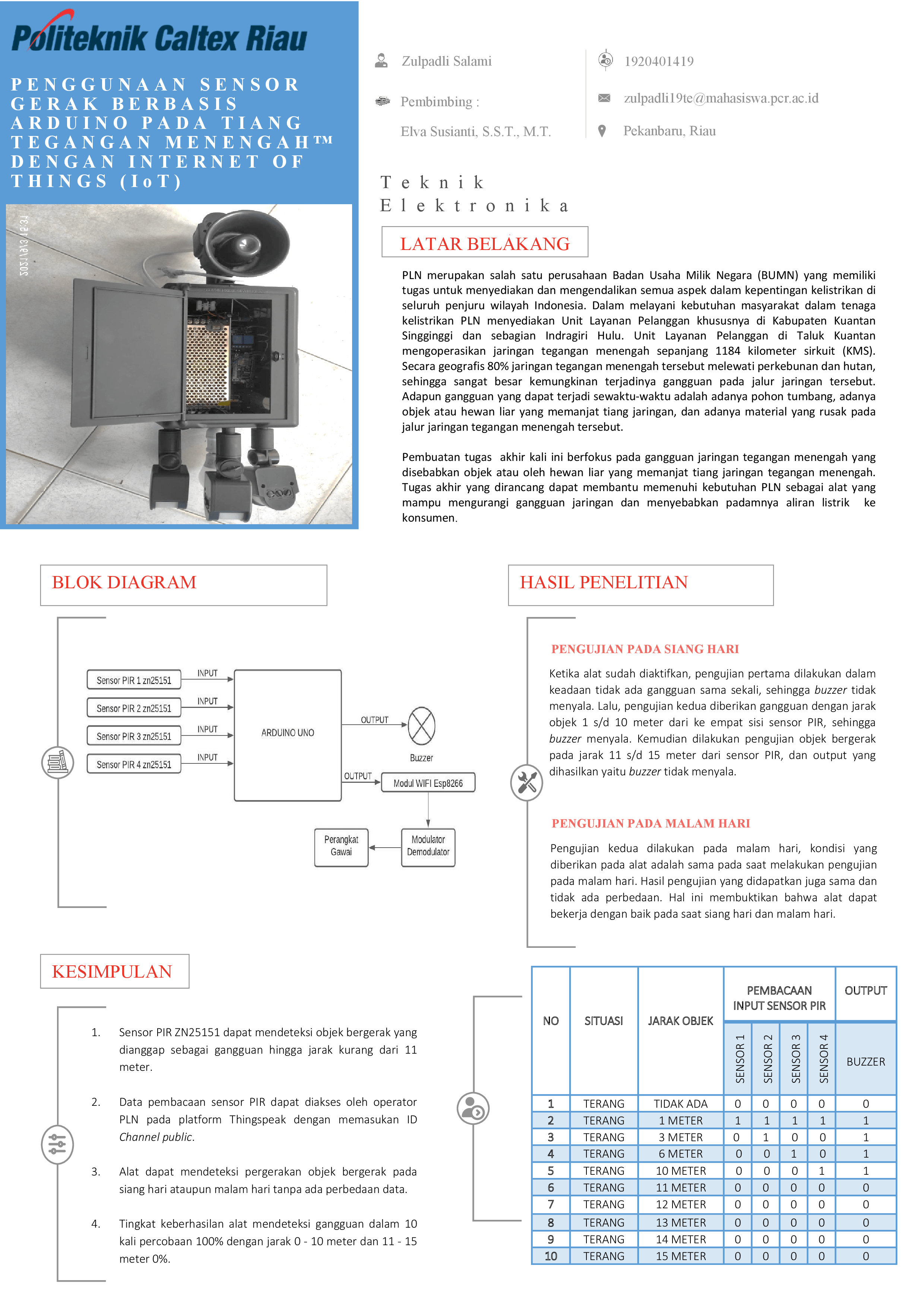 Penggunaan Sensor Gerak Berbasis Arduino Pada Tiang Tegangan Menengah (Tm) dengan Internet of Things (Iot) merupakan sebuah alat yang dapat meminimalisir gangguan pada tiang tegangan menengah milik Perusahaan Listrik Negara (PLN). Gangguan yang terjadi dapat menjadi pokok permasalahan yang menyebabkan pemadaman listrik yang dialirkan kepada konsumen. Alat ini menggunakan 4 (empat) buah sensor PIR ZN25151 sebagai pendeteksi adanya gangguan disekitar tiang tegangan menengah. Serta, menggunakan Arduino UNO sebagai pengendalinya, yang akan mengaktifkan relay untuk dapat menyalakan buzzer, apabila sensor PIR mendeteksi adanya gangguan. Lain daripada itu, pergerakan yang terdeteksi oleh sensor PIR akan masuk ke Arduino dan dikirimkan ke Platform Internet of Things yaitu Thingspeak, dimana data ini dapat dilihat melalui perangkat gawai yang terhubung dengan Thingspeak. Alat ini menggunakan Modul Wifi Esp8266 dan Modulator Demodulator (Modem) untuk dapat menyediakan jaringan internet di lapangan. Penggunaan Sensor Gerak Berbasis Arduino Pada Tiang Tegangan Menengah (Tm) dengan Internet of Things (Iot) ini mampu membaca adanya gangguan dilapangan, dan menampilkan data yang akurat pada database Thingspeak yang digunakan. Tingkat keberhasilan alat membaca adanya gangguan adalah 100% dalam 10 kali uji coba lapangan dengan jarak uji coba yang bervariasi hingga jarak gangguan 10 meter.