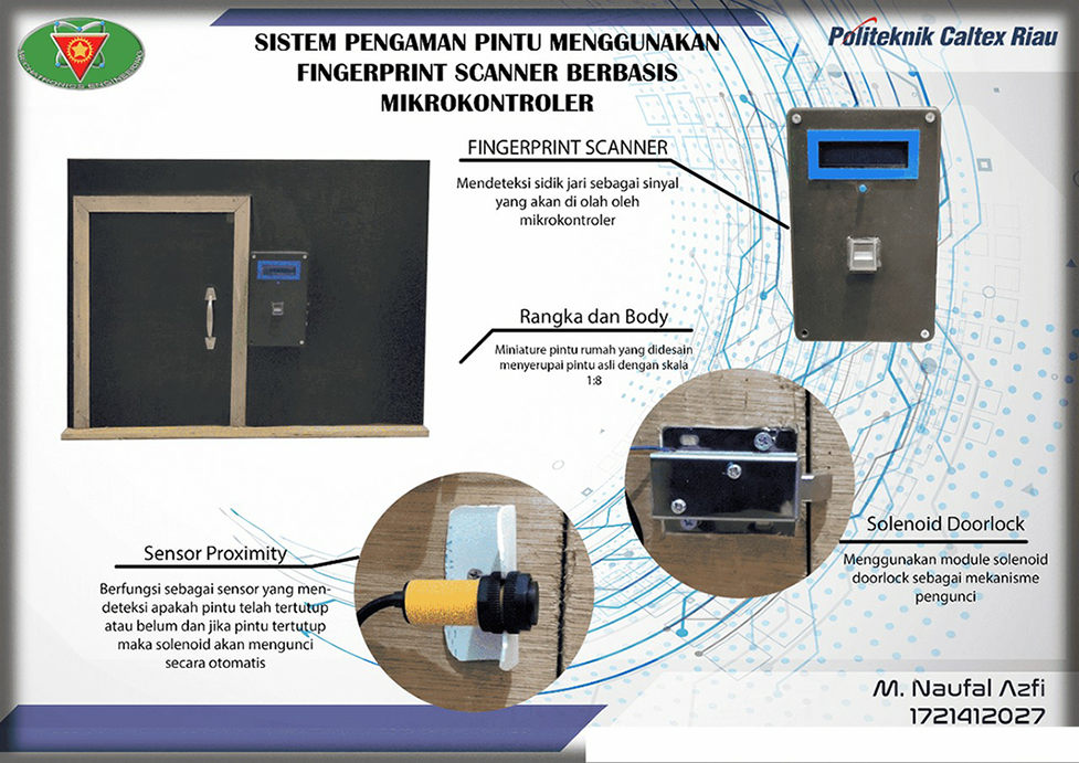 Pada era globalisasi saat ini teknologi biometri sudah berkembang pesat. Sistem biometri baik dikembangkan untuk sistem keamanan karena dapat memenuhi fungsi identifikasi dan verifikasi. Seperti kita ketahui bersama, tindak kriminal di Indonesia mengalami peningkatan dari tahun ke tahun, salah satunya adalah perampokan pada rumah-rumah masyarakat yang tingkat keamanannya yang masih lemah karena masih menggunakan kunci pintu secara manual. Maka dari itu, dibuatlah sistem pengaman pintu menggunakan fingerprint scanner berbasis mikrokontroler. Pada alat ini, pendafataran sidik jari dilakukan dengan menggunakan software SFG Demo, dengan kapasitas maksimal penyimpanan sidik jari sebanyak 300, untuk waktu record (pembacaan) pola sidik jari saat pendaftaran sampai data tersimpan memakan waktu rata-rata 21,66 detik, dan proses sensor fingerprint mengidentifikasi sidik jari membutuhkan waktu 3-5 detik. Solenoid doorlock yang berfungsi sebagai pengunci pintu, akan aktif (membuka) apabila sensor fingerprint mengidentifikasi sidik jari yang valid (terdaftar), dan akan kembali mengunci ketika sensor proximity telah mendeteksi pintu sudah kembali menutup. Setiap data akses sidik jari, data user dan waktu akses akan tersimpan ke dalam modul micro sd. Tingkat keberhasilan kerja alat ini adalah 100% berhasil, baik itu identifikasi sidik jari sensor fingerprintnya maupun sistem pengunci solenoidnya.