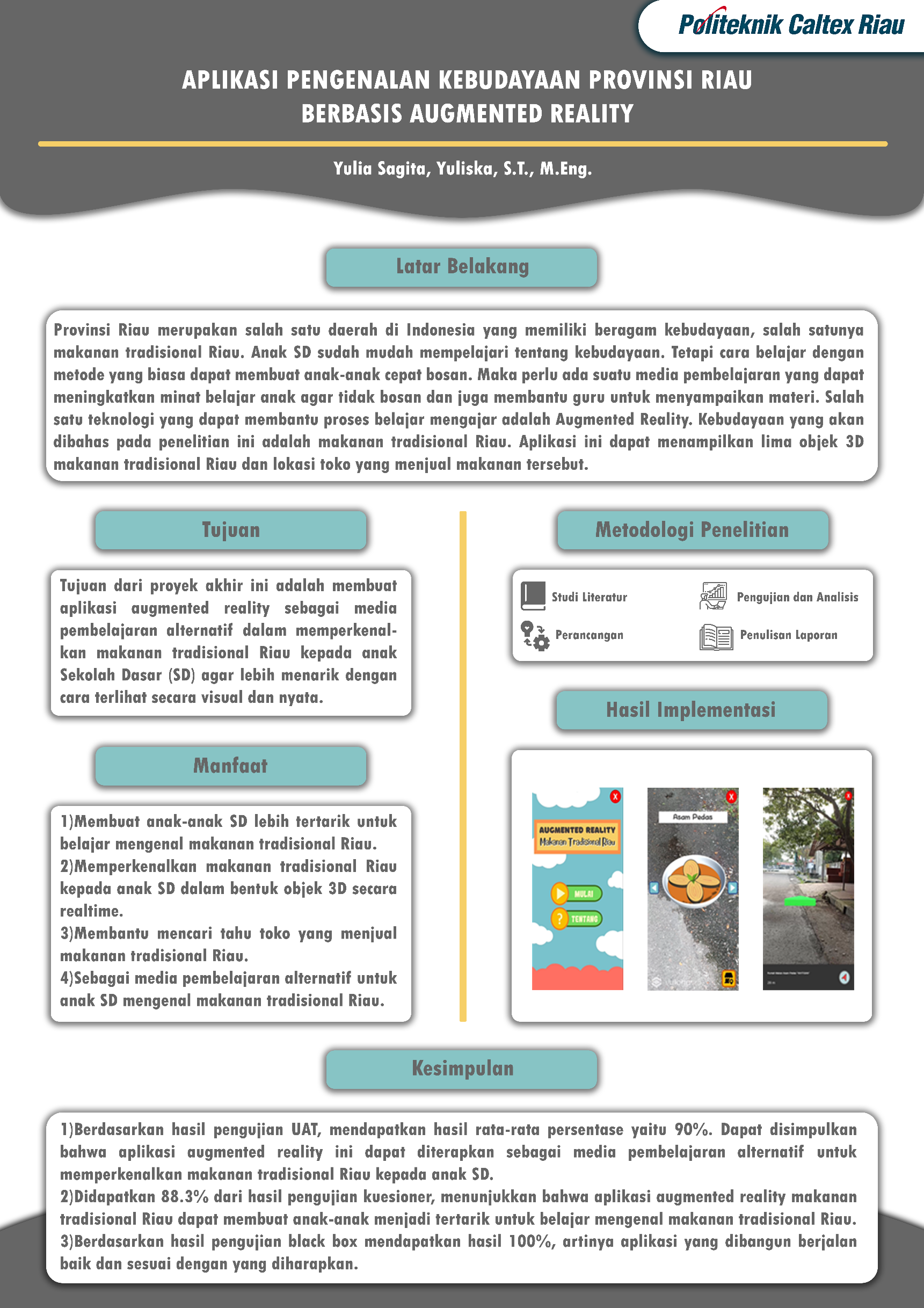 pembelajaran alternatif untuk memperkenalkan makanan tradisional Riau kepada anak SD. Dari hasil pengujian kuesioner kepada anak SD didapat 88.3% yang berarti aplikasi dapat membuat anak-anak tertarik untuk belajar mengenal makanan tradisional Riau.