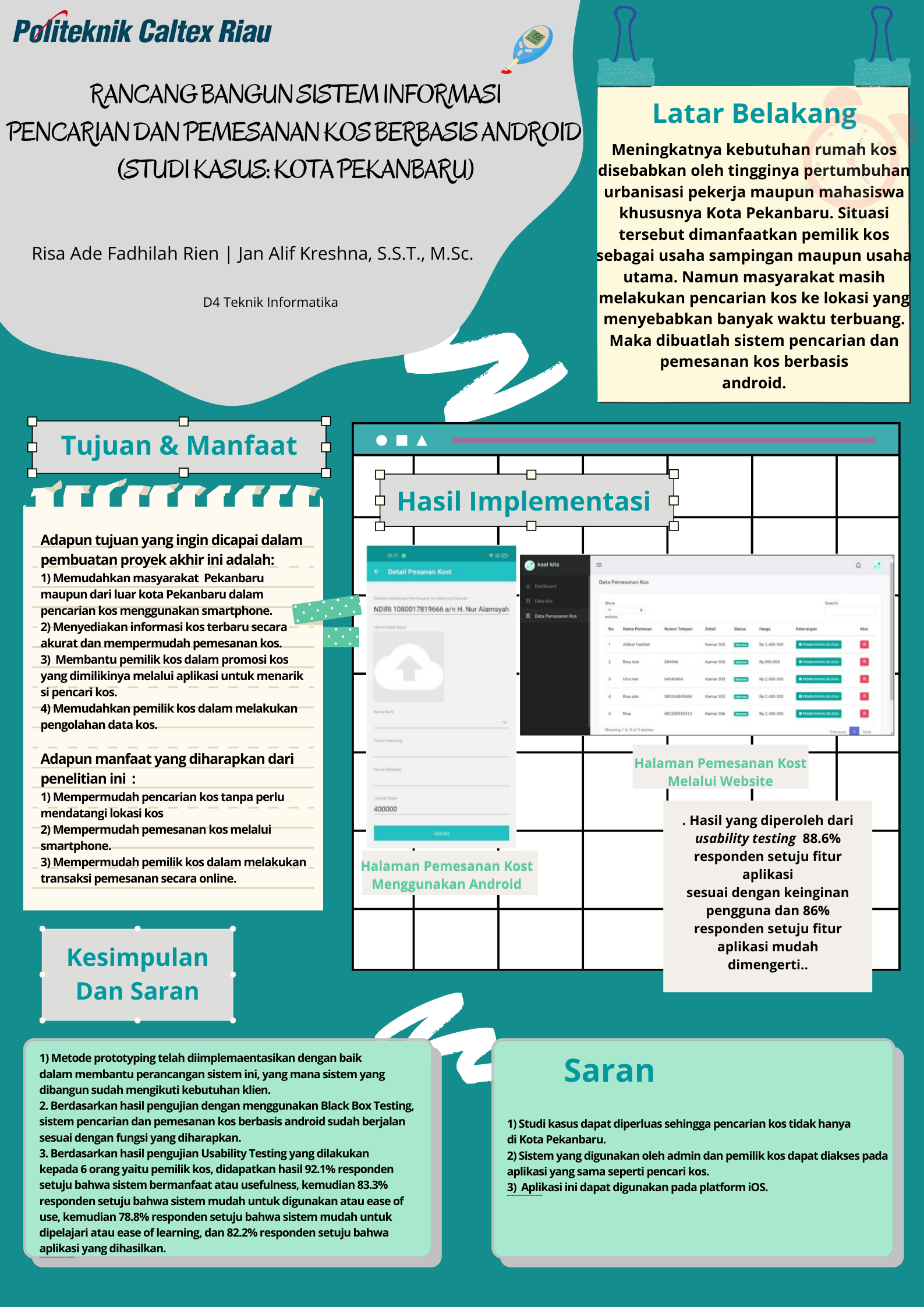 Meningkatnya kebutuhan rumah tinggal sementara seperti rumah kos disebabkan oleh tingginya pertumbuhan urbanisasi pekerja maupun mahasiswa di Indonesia khususnya Kota Pekanbaru. Pekerja maupun mahasiswa yang berasal dari luar daerah harus mencari rumah kos yang berada area lokasi mereka bekerja dan kuliah. Situasi tersebut dimanfaatkan pemilik kos sebagai usaha sampingan maupun usaha utama. Namun masyarakat masih melakukan pencarian kos ke lokasi yang menyebabkan banyak waktu terbuang dan harus mencari kos-kosan lebih cepat agar mendapat tempat yang diinginkan. Dari permasalahan tersebut, maka dibuatlah sistem pencarian dan pemesanan kos berbasis android. Sistem ini dapat memberikan informasi yang memudahkan untuk mencari kos dengan harga, ukuran kamar, dan ¬furniture-furniture yang sesuai keinginan. Sistem ini menggunakan metode prototyping dalam pengembangannya karena akan mudah mengkoordinasikan sistem, pengembang dan pencari kos, serta waktu yang dibutuhkan menjadi lebih singkat. Sistem ini juga dilengkapi dengan foto 360˚ yang digunakan untuk melihat bentuk dari kamar kos. Berdasarkan hasil pengujian yang dilakukan menggunakan black box, didapatkan hasil bahwa aplikasi sudah 100% berhasil dibangun sesuai yang diharapkan. Selanjutnya berdasarkan hasil pengujian kuesioner dan usability didapatkan hasil bahwa pencari kos setuju aplikasi ini dapat membatu mencari dan memesan kos-kosan dan pemilik kos setuju aplikasi ini bermanfaat dan dapat membantu mempromosikan kos.