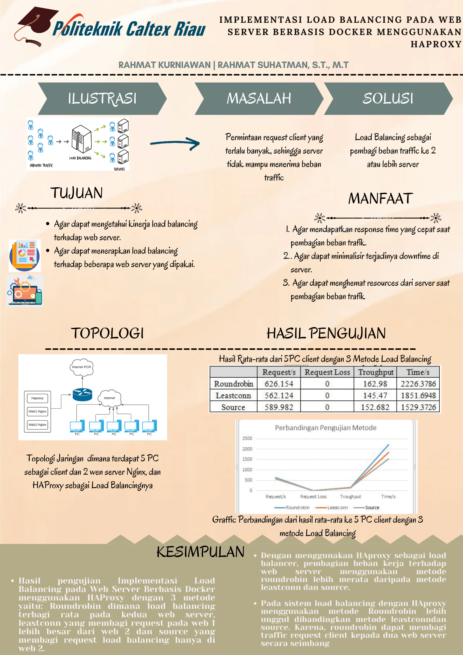 Docker adalah sebuah proyek yang bersifat open source dibawah lisensi Apache Versi 2.0 yang bisa digunakan secara gratis oleh developer dan berfungsi sebagai wadah atau container untuk memasukkan sebuah aplikasi secara lengkap beserta semua hal lainnya yang dibutuhkan sehingga dapat berjalan sesuai kebutuhan. Pada proyek akhir ini saya meng implementasikan load balancing web server berbasis docker dengan menggunakan HAProxy dimana Load Balancing merupakan teknik untuk mendistribusikan beban trafik pada dua atau lebih jalur koneksi secara seimbang, agar trafik dapat berjalan optimal, memaksimalkan throughput, memperkecil waktu tanggap dan menghindari overload pada salah satu jalur koneksi, artinya dengan implementasi proyek akhir ini dimana load balancing yang digunakan untuk mengoptimalkan lajur trafik menggunakan open source docker dan di support HAProxy dapat dijadikan salah satu cara untuk penggunaan hal yang demikian. Hasil pengujian Implementasi Load Balancing pada Web Server Berbasis Docker menggunakan HAProxy dengan 3 metode yaitu: Roundrobin dimana load balancing terbagi rata pada kedua web server, leastconn yang membagi request pada web 1 lebih besar dari web 2 dan source yang membagi request load balancing hanya di web 2.