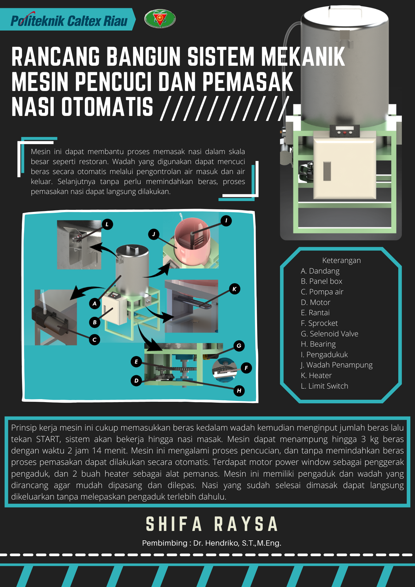Beras merupakan salah satu makanan paling penting di dunia khususnya di Indonesia. Sebelum diolah menjadi nasi, beras akan dicuci terlebih dahulu. Pencucian beras dalam skala besar oleh industri rumah tangga masih dilakukan dengan menggosokan beras pada air menggunakan tangan. Mesin Pencuci dan Pemasak Nasi Otomatis ini akan membantu proses pengolahan nasi. Hal ini dapat meningkatkan produksi dan mengurangi tenaga manusia. Cara kerja mesin ini cukup memasukkan beras kedalam wadah kemudian menginput jumlah beras lalu tekan START, maka sistem akan bekerja hingga nasi masak. Dari hasil pengujian mesin dapat menampung hingga 3 kg beras dengan waktu 2 jam 14 menit untuk hasil nasi yang matang. Mesin ini mengalami proses pencucian, dan tanpa memindahkan beras proses pemasakan dapat dilakukan secara otomatis. Mesin ini menggunakan motor power window sebagai penggerak pengaduk saat mencuci dan saat pemasakan, dan juga menggunakan 2 buah heater sebagai alat pemanas. Mesin ini memiliki pengaduk dan wadah yang dirancang agar mudah dipasang dan dilepas. Nasi yang sudah masak dapat langsung dikeluarkan tanpa melepaskan pengaduk. Pengaduk dan wadah yang digunakan sangat efisien. Pemasangan pengaduk memerlukan waktu selama 2.74 detik/Kg dan 6.24 detik/Kg untuk melepaskannya. Sedangkan pemasangan wadah hanya 5.12 detik/Kg dan 3.29 detik/Kg untuk mengaangkat wadah dan pengaduk sekaligus terangkat.