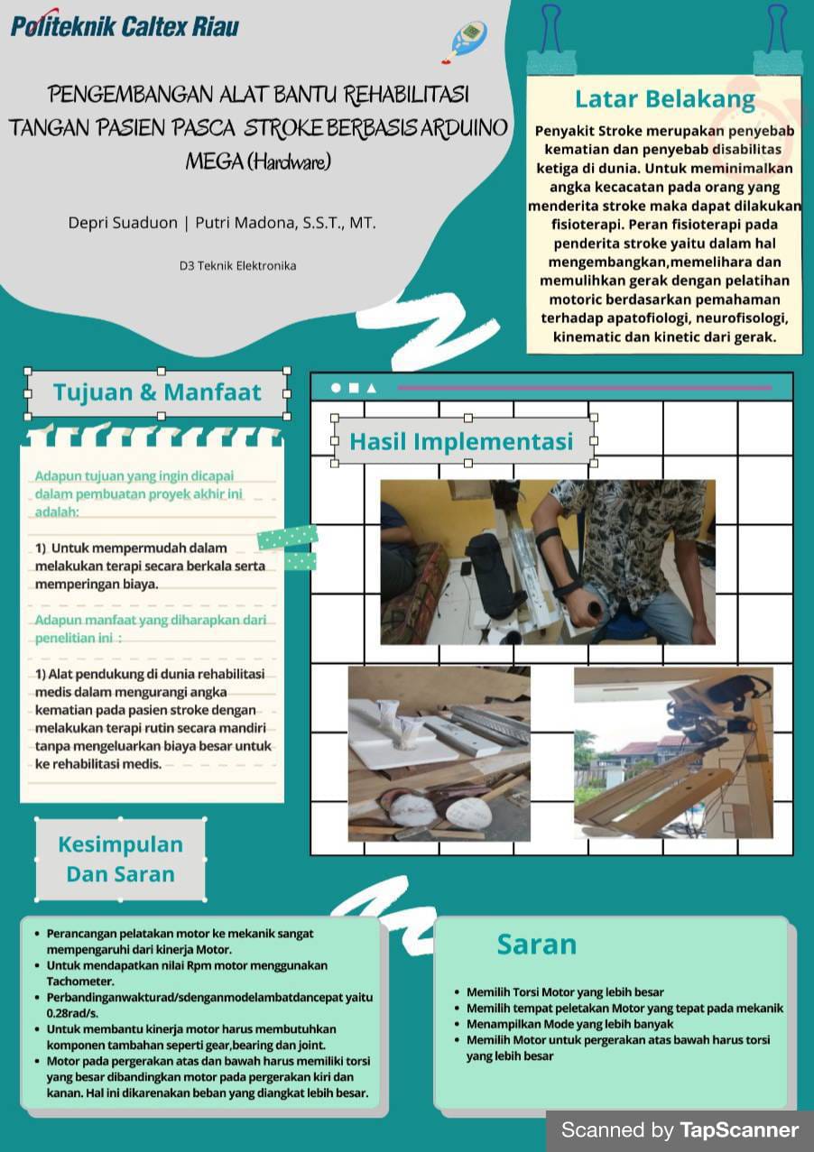 Stroke merupakan gangguan fungsi otak akibat aliran darah ke otak mengalami gangguan.Hal ini mengacu pada peristiwa yang dirasakan membahayakan otak karena nutrisi dan oksigen yang dibutuhkan oleh otak tidak terpenuhi dengan baik.Salah satu dampak akibat stroke pada manusia adalah hilang nya kesadaran dan sulit menggerakkan anggota tubuh.Oleh karena itu dibutuhkan sebuah Alat Bantu Rehabilitasi Tangan Pasien Pasca Stroke yang digunakan untuk melakukan terapi mandiri dirumah secara berkala sehingga dapat mengurangi kelumpuhan dan peningkatan disabilitas pasca stroke.Kurangnya pengetahuan masyarakat dalam melakukan penanganan pasien stroke dan belum adanya sistem informasi rehabilitasi yang terpadu.Pengembangan Alat Bantu Rehabilitasi Tangan Pasien Pasca Stroke ini dikontrol menggunakan mikrokontroler berbasis Arduino Mega.Sebagai penggerak menggunakan Motor Servo untuk menahan beban tangan pasien yang dilakukan dengan 4 mode pergerakkan reahbilitasi.Mode satu: Gerakan siku ke kanan, kedua: Gerakan siku ke Arah kiri, Ketiga : Gerakan siku ke arah atas dank keempat : Gerakan siku kea rah bawah.Dengan pergerakkan ini dapat mengurangi tingkay disabilitas pasien stroke.Kata kunci: Stroke,Arduino,Motor Servo Motor Driver,Keypad ,I2C, dan LC