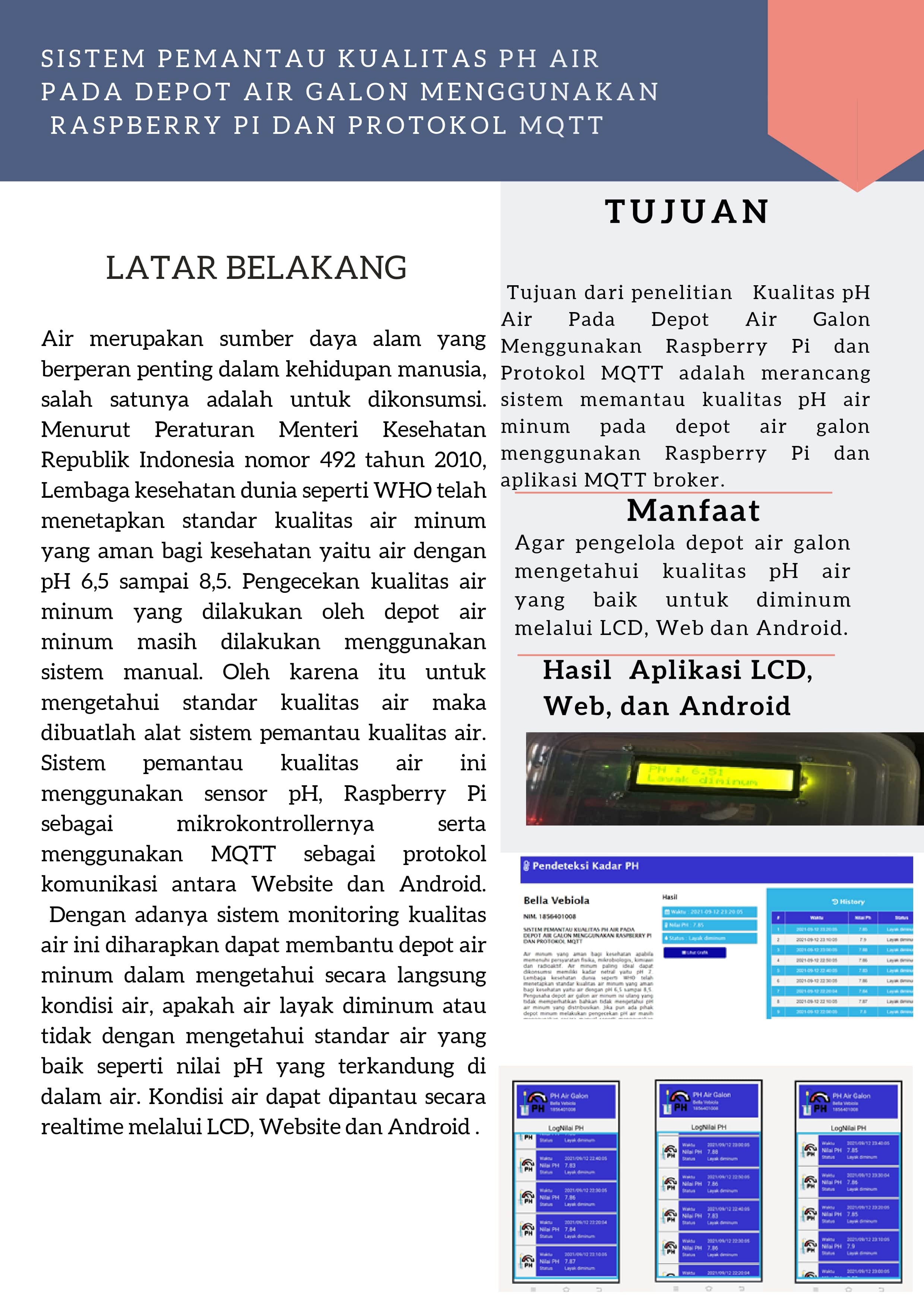Kata kunci: Depot air minum, Sensor pH, Raspberry Pi, MQTT, Website, Android, LCD