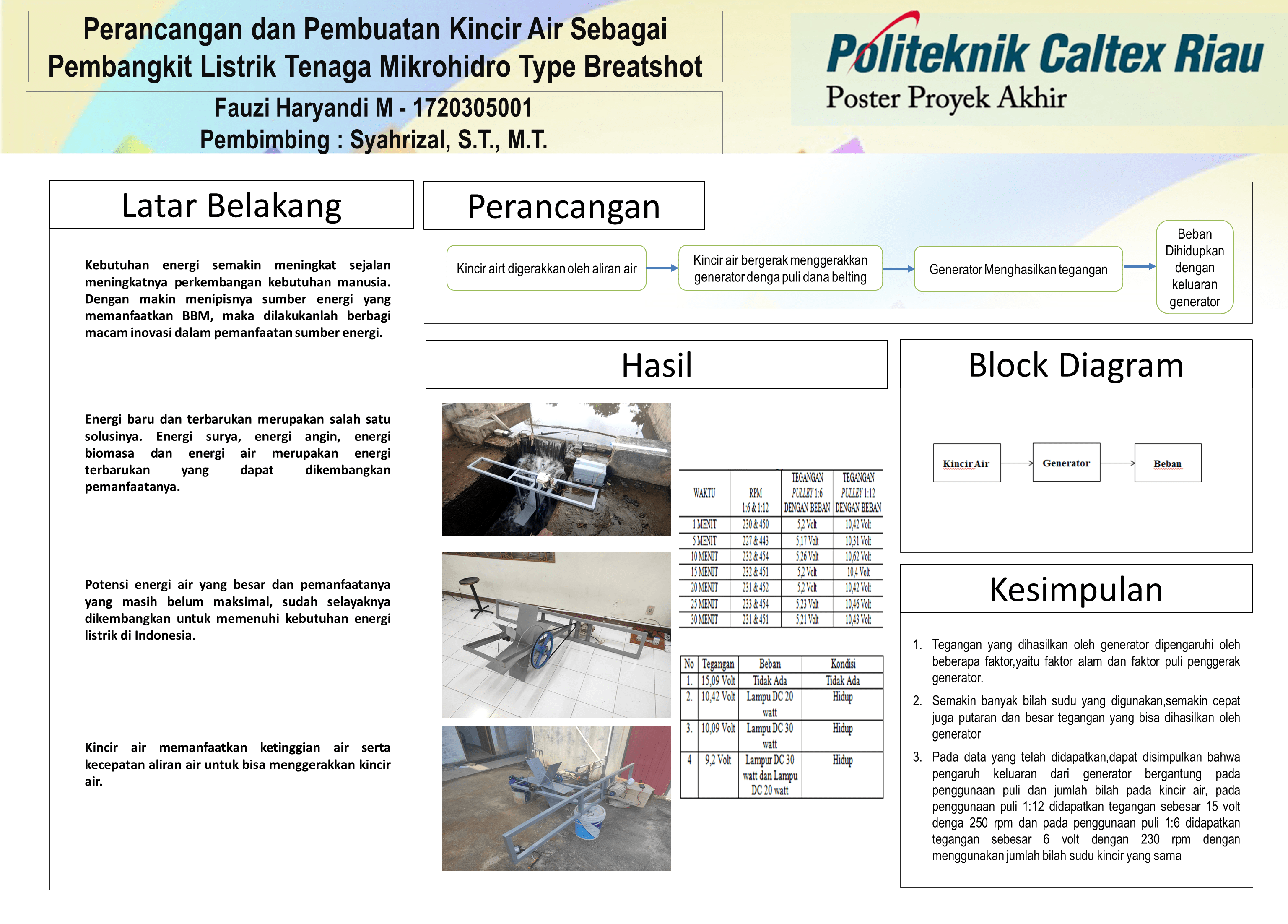 Listrik merupakan salah satu jenis energi yang paling banyak diaplikasikan dalam kehidupan sehari-hari sehingga kebutuhan akan energi ini sangat tinggi. Berbagai jenis pembangkit listrik telah banyak dikembangkan.Salah satunya pembangkit listrik tenaga mikrohidro. Pembangkit listrik tenaga air (mikrohidro) memanfaatkan kecepatan aliran dan debit air sebagai tenaga utama dalam menghasilkan listrik. Pembangkit Listrik Tenaga Mikrohidro (PLTMh) merupakan salah satu contoh pembangkit yang paling banyak digunakan untuk menghasilkan energi listrik. Tenaga air berasal dari danau yang mempunyai bendungan yang cukup untuk menampung air. Pada Proyek akhir ini menggunakan bahan mekanik seperti besi hollow,bearing,saf,mur,baut, plat besi, dan besi U. Ketika proyek akhir ini dijalankan, kincir air tersebut dapat memutar generator DC dan generator tersebut mendapatkan tegangan sebesar 15 Volt tanpa beban dengan Rpm sebesar 450 dengan pulley 1:12. Pada penggunaan pulley 1:6 didapatkan keluaran generator sebesar 6 Volt dengan Rpm sebesar 230. Saat Menggunakan pulley 1:12 generator dapat menghidupkan 2 buah lampu DC sebesar 20 Watt dan 30 Watt secara bersamaan tetapi mengurangi tegangannya hingga turun menjadi 9,21 Volt. Hal ini dapat terjadi karena daya generator tidak cukup untuk menghidupkan lampu DC tersebut hinggal membuat drop hasil tegangan dari generator tersebut