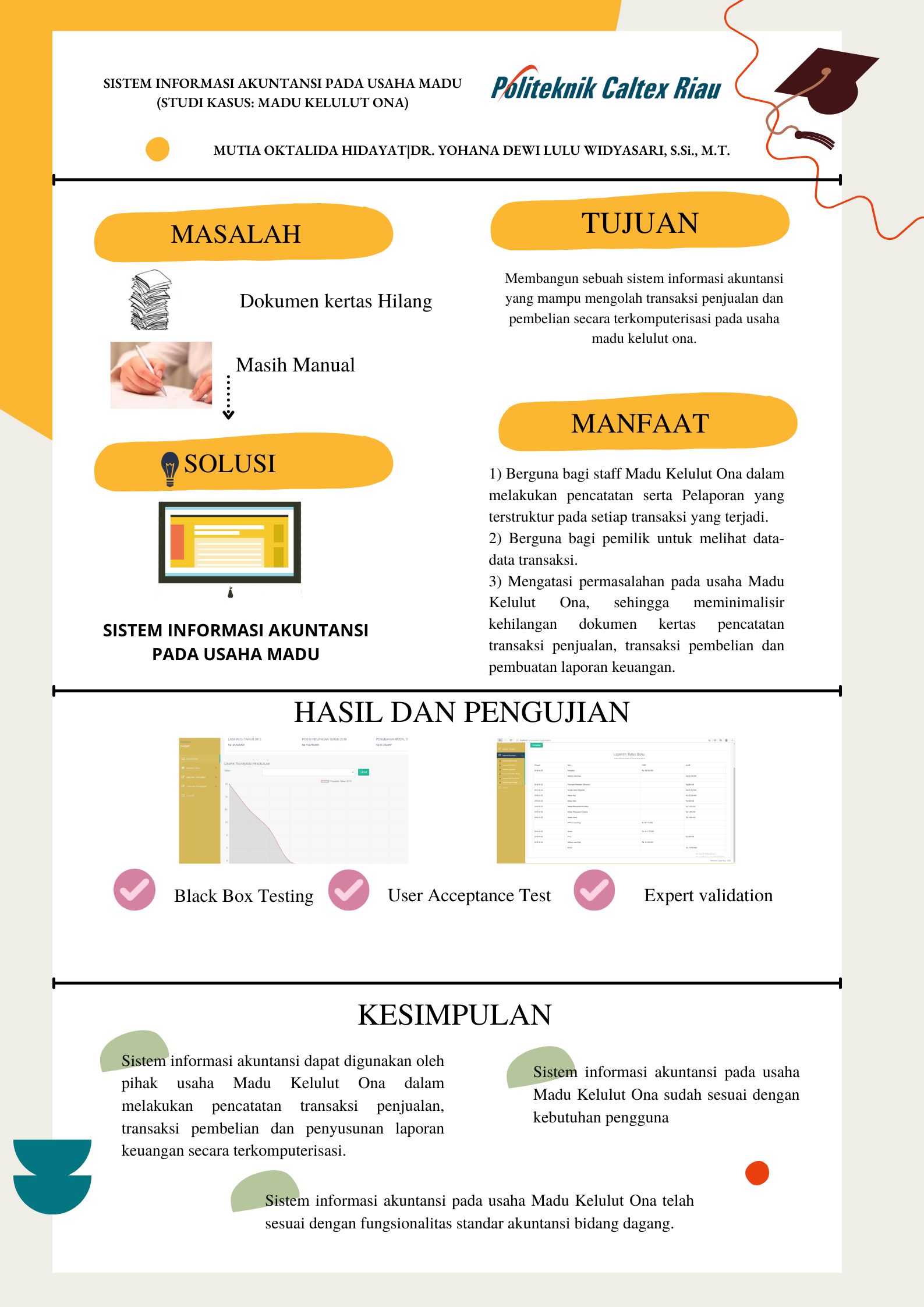 Madu Kelulut Ona adalah usaha madu ternak lebah kelulut yang bergerak di bidang perdagangan. Usaha Madu Kelulut Ona terdapat aktivitas ekonomi seperti penjualan, pembelian, dan penyusunan laporan mengenai transaksi jual beli di perusahaan. Hasil wawancara yang dilakukan dengan pemilik usaha, pencatatan transaksi jual beli serta penyusunan laporan keuangan perusahaan belum dilakukan secara optimal. Perusahaan masih melakukan pencatatan secara manual. Selain masalah pencatatan, petugas juga mengalami kesulitan dalam melakukan pencarian data history transaksi, dikarenakan penyimpanan dokumen masih disimpan dalam bentuk lembaran kertas. Pencatatan yang dilakukan menyebabkan pengolahan dan penyusunan laporan keuangan perusahaan kurang efektikf. Solusi dari permasalahan ini adalah membuat sebuah Sistem Informasi Akuntansi Pada Usaha Madu Kelulut Ona. Pengembangan dari sistem yang dibangun dengan menggunakan metode waterfall. Hasil transaksi yang dilakukan oleh petugas dapat langsung dievaluasi oleh pemilik usaha. Dari pengujian yang dilakukan dengan menggunakan Test Case dari Black Box Testing didapatkan hasil 100%. Keseluruhan fungsionalitas sistem sesuai dengan harapan perusahaan. Hasil pengujian (User Acceptance Testing) didapatkan bahwa hasil rata-rata keseluruhan sistem telah dapat diterima oleh user dengan nilai 97%. Hasil pengujian pakar akuntansi adalah sistem Informasi Akuntansi Usaha Madu Kelulut Ona sudah memenuhi standar akuntansi di bidang dagang.