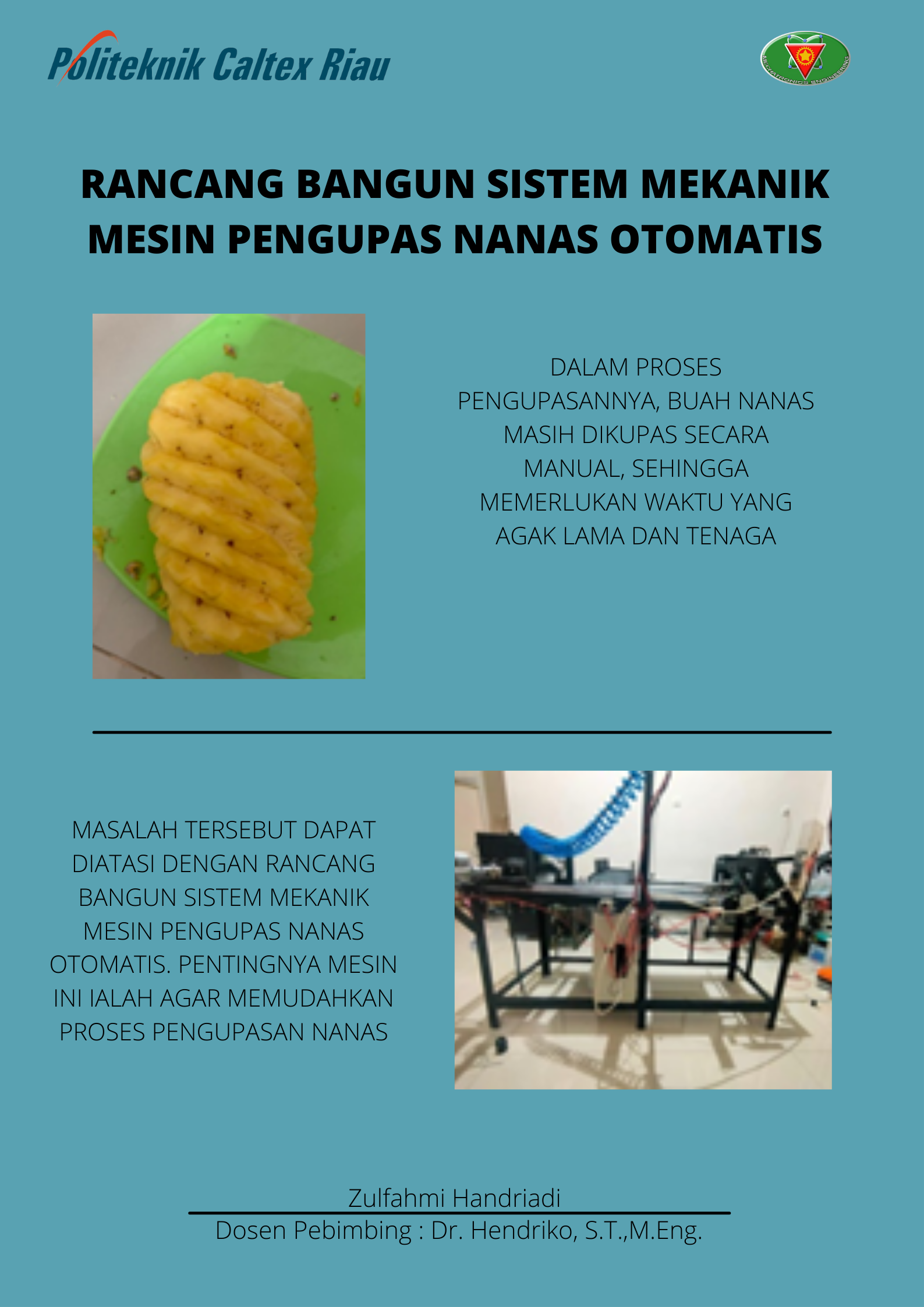 Keripik nanas, jus nanas, selai, dan sebagainya merupakan makanan dan minuman yang sudah tidak asing lagi di zaman sekarang. Namun, dalam proses pembuatannya masih dilakukan pengupasan secara manual atau masih membutuhkan kerja manusia dalam proses nya. Masalah tersebut dapat diatasi dengan mesin pengupas otomatis. Dimana mesin ini terdiri dari beberapa proses, di antaranya yaitu proses memasukkan nanas yang diatur oleh selenoid, dilanjutkan dengan proses pencekaman nanas menggunakan motor linear dan terakhir proses pengupasan kulit nanas Mesin ini dirancang menggunakan pisau spiral, terlebih dahulu meletakkan buah nanas didalam wadah miring yang dilengkapi selenoid untuk mengatur jatuhmya buah, kemudian menekan tombol on pada panel, kemudian nanas akan jatuh ke kotak pencekam, selanjutnya kotak pencekam akan melakukan proses pencekaman menggunakan motor linear, lalu kotak akan maju ke pisau spiral yang memutar, setelah pengupasan selesai lalu kotak pencekam akan membawa kulit nanas ke belakang untuk dibuang. Dengan Mesin Pengupas dan Pengiris Buah Nanas Otomatis, dapat mengupas buah nanas dengan waktu singkat yaitu Dalam 1 jam mesin pengupas buah nanas otomatis ini dapat mengupas sebanyak 67 buah nanas dan menghasilkan 82,88 kg daging nanas bersih. Sehingga waktu pemotongan dalam skala besar akan sangat menghemat waktu.