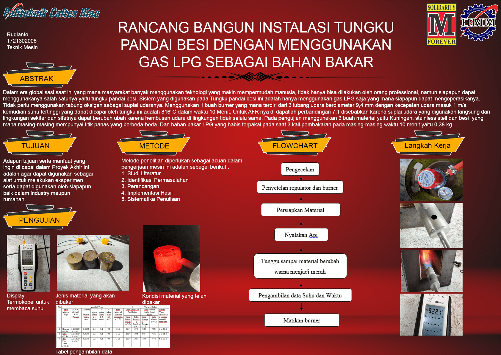Dalam era globalisasi saat ini yang mana masyarakat banyak menggunakan teknologi yang makin mempermudah manusia, tidak hanya bisa dilakukan oleh orang professional, namun siapapun dapat menggunakanya salah satunya yaitu tungku pandai besi. Sistem yang digunakan pada Tungku pandai besi ini adalah hanya menggunakan gas LPG saja yang mana siapapun dapat mengoperasikanya. Tidak perlu menggunakan tabung oksigen sebagai suplai udaranya. Menggunakan 1 buah burner yang mana terdiri dari 3 lubang udara berdiameter 9,4 mm dengan kecepatan udara masuk 1 m/s. kemudian suhu tertinggi yang dapat dicapai oleh tungku ini adalah 816°C dalam waktu 10 Menit. Untuk AFR nya di dapatlah perbandingan 7:1 disebabkan karena suplai udara yang digunakan langsung dari lingkungan sekitar dan sifatnya dapat berubah ubah karena hembusan udara di lingkungan tidak selalu sama. Pada pengujian menggunakan 3 buah material yaitu Kuningan, stainless stell dan besi yang mana masing-masing mempunyai titik panas yang berbeda-beda. Dan bahan bakar LPG yang habis terpakai pada saat 3 kali pembakaran pada masing-masing waktu 10 menit yaitu 0,36 kg