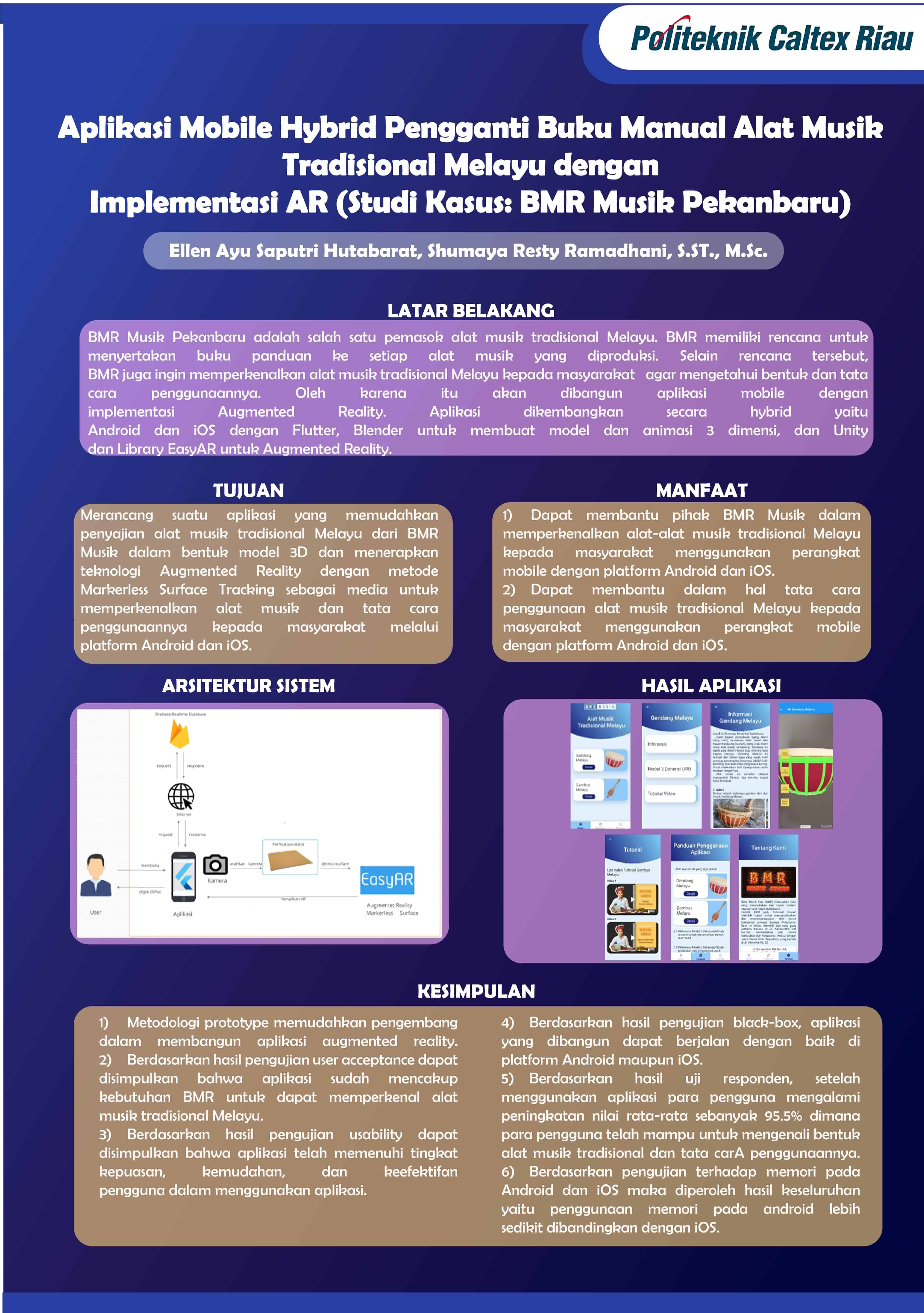 BMR Musik Pekanbaru adalah salah satu pemasok alat musik tradisional Melayu. BMR memiliki rencana untuk menyertakan buku panduan ke setiap alat musik yang diproduksi. Selain rencana tersebut, BMR juga ingin memperkenalkan alat musik tradisional Melayu kepada masyarakat agar mengetahui bentuk dan tata cara penggunaannya. Oleh karena itu akan dibangun aplikasi mobile dengan implementasi AR (Augmented Reality). Aplikasi dikembangkan secara hybrid yaitu Android dan iOS dengan Flutter, Blender untuk membuat model dan animasi 3 dimensi, dan Unity dan Library EasyAR untuk Augmented Reality. Metode prototyping dilakukan sebanyak 3 iterasi dengan pihak BMR. Hasil dari pengujian Blackbox yaitu seluruh kebutuhan fungsional 100% berhasil dijalankan. Pada User Acceptance Testing, diperoleh rata-rata dari seluruh aspek yaitu 87.5% telah memenuhi kebutuhan fungsional pengguna. Pengujian Usability memperoleh hasil rata-rata seluruh aspek pada Android yaitu 89% dan iOS yaitu 86.3% yang menandakan bahwa aplikasi dapat dijalankan dengan mudah. Pada One-Group Pretest-Posttest Design hasil yang diperoleh pada post-test sebesar 95.5% dan kesimpulannya aplikasi ini dapat membantu pengguna dalam mengenal bentuk alat musik dan tata cara penggunaannya. Hasil dari pengujian kinerja yaitu Android mengalami kenaikan penggunaan memori sebanyak 6.61% dan iOS sebanyak 53.6% saat menampilkan AR. Kesimpulannya adalah Android menggunakan lebih sedikit memori daripada iOS.