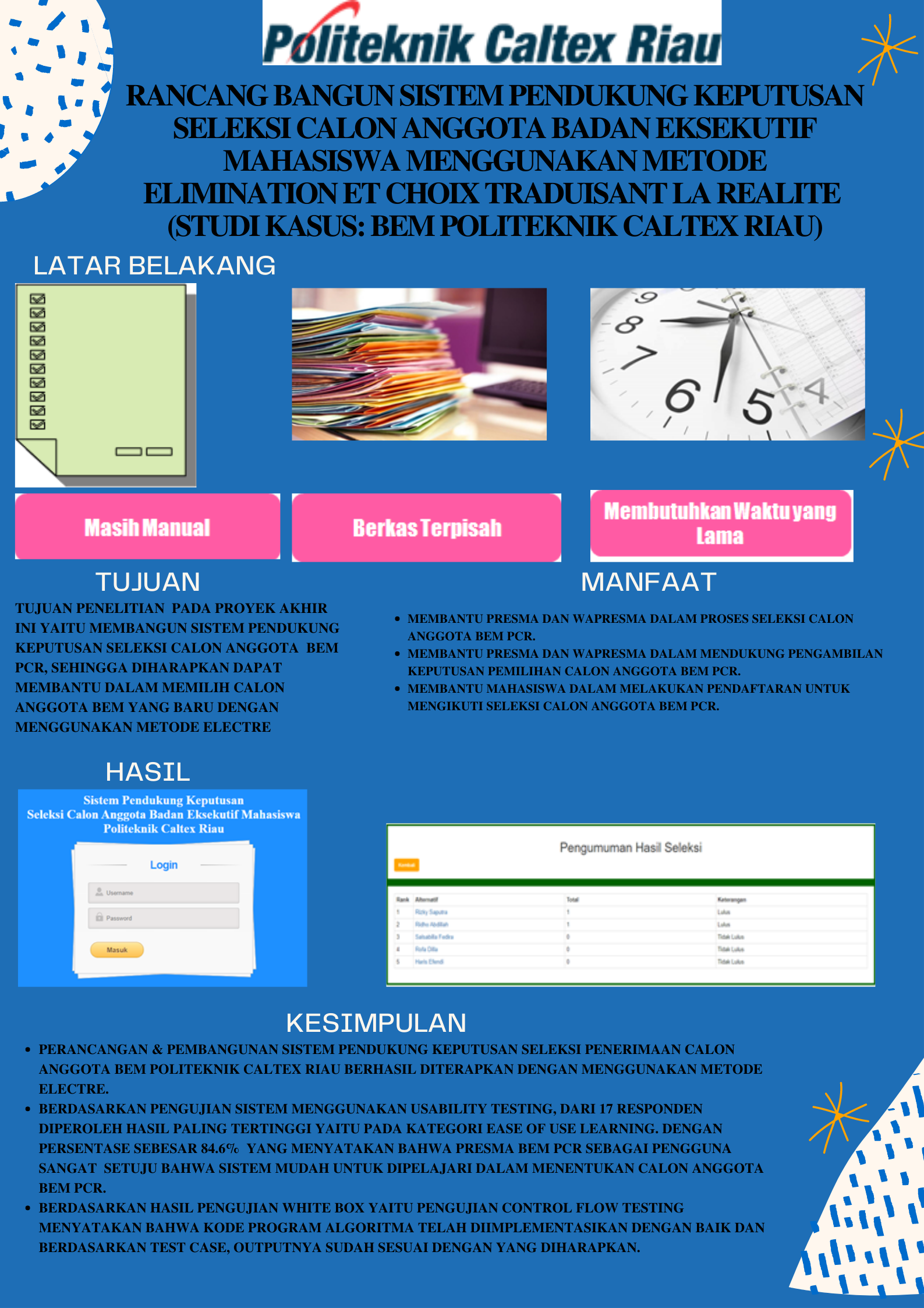 RANCANG BANGUN SISTEM PENDUKUNG KEPUTUSAN SELEKSI CALON ANGGOTA BADAN EKSEKUTIF MAHASISWA MENGGUNAKAN METODE ELIMINATION ET CHOIX TRADUISANT LA REALITE (STUDI KASUS: BEM POLITEKNIK CALTEX RIAU)