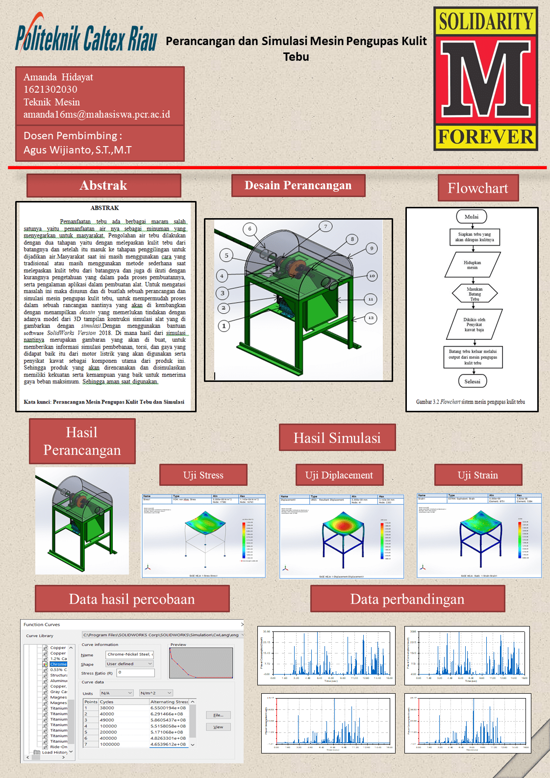 Pemanfaatan tebu ada berbagai macam salah satunya yaitu pemanfaatan air nya sebagai minuman yang menyegarkan untuk masyarakat. Pengolahan air tebu dilakukan dengan dua tahapan yaitu dengan melepaskan kulit tebu dari batangnya dan setelah itu masuk ke tahapan penggilingan untuk dijadikan air.Masyarakat saat ini masih menggunakan cara yang tradisional atau masih menggunakan metode sederhana saat melepaskan kulit tebu dari batangnya dan juga di ikuti dengan kurangnya pengetahuan yang dalam pada proses pembuatannya, serta pengalaman aplikasi dalam pembuatan alat. Untuk mengatasi masalah ini maka disusun dan di buatlah sebuah perancangan dan simulasi mesin pengupas kulit tebu, untuk mempermudah proses dalam sebuah rancangan nantinya yang akan di kembangkan dengan menampilkan desain yang memerlukan tindakan dengan adanya model dari 3D tampilan kontruksi simulasi alat yang di gambarkan dengan simulasi.Dengan menggunakan bantuan software SolidWorks Version 2018. Di mana hasil dari simulasi nantinya merupakan gambaran yang akan di buat, untuk memberikan informasi simulasi pembebanan, torsi, dan gaya yang didapat baik itu dari motor listrik yang akan digunakan serta penyikat kawat sebagai komponen utama dari produk ini. Sehingga produk yang akan direncanakan dan disimulasikan memiliki kekuatan serta kemampuan yang baik untuk menerima gaya beban maksimum. Sehingga aman saat digunakan.