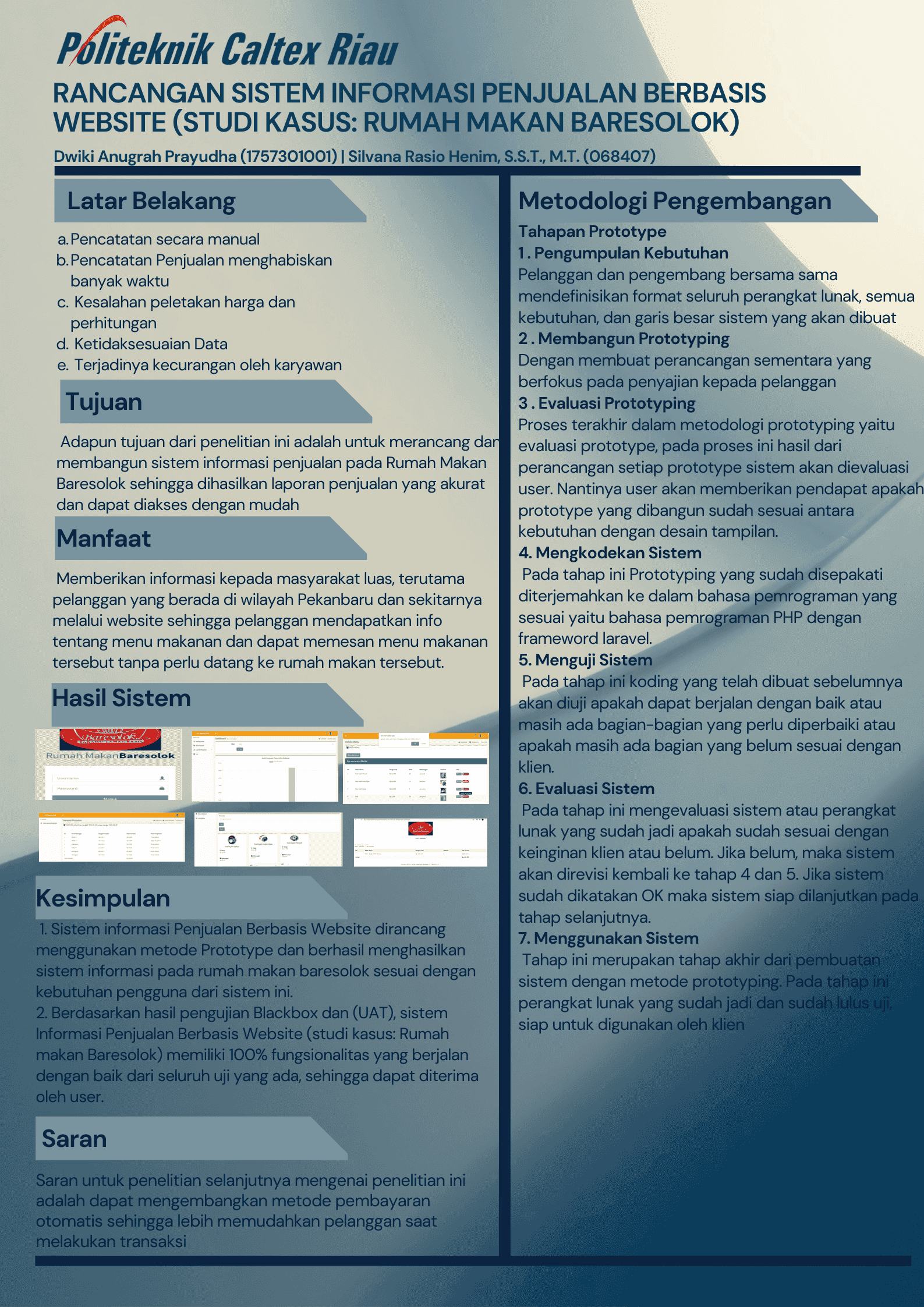 Rumah Makan Baresolok merupakan sebuah rumah makan sederhana yang bergerak di bidang kuliner yang menjual masakan khas padang, aneka minuman, dan hidangan lainnya. Rumah Makan Baresolok terkenal dengan hidangannya yang khas, maka tidak heran Rumah Makan Baresolok memiliki banyak pelanggan yang setia. Akan tetapi, kegiatan administrasi penjualannya masih melakukan secara manual. Hal ini mengakibatkan sering terjadinya ketidaksesuaian data dan menghabiskan banyak waktu. Tidak hanya itu beberapa masalah terjadi dikarenakan masih menggunakan buku dan kalkulator sebagai pencatatan transaksi, seperti kesalahan peletakan harga, kesalahan perhitungan, dan terkadang karyawan rumah makan melakukan kecurangan. Berdasarkan permasalahan yang ada, maka dibuatlah sebuah sistem informasi penjualan berbasis web untuk Rumah Makan Baresolok. Sistem informasi penjualan ini dibangun menggunakan bahasa pemrograman PHP dan DBMS (Database Management System) MySQL dengan bantuan framework Laravel. Sistem ini dikembangkan dengan menggunakan metode Prototype. Hasil akhir yang diperoleh adalah sebuah sistem informasi penjualan berbasis web yang digunakan oleh Rumah Makan Baresolok. Sistem ini mampu memberikan promosi menu makanan, penjualan dan pemesanan makanan.