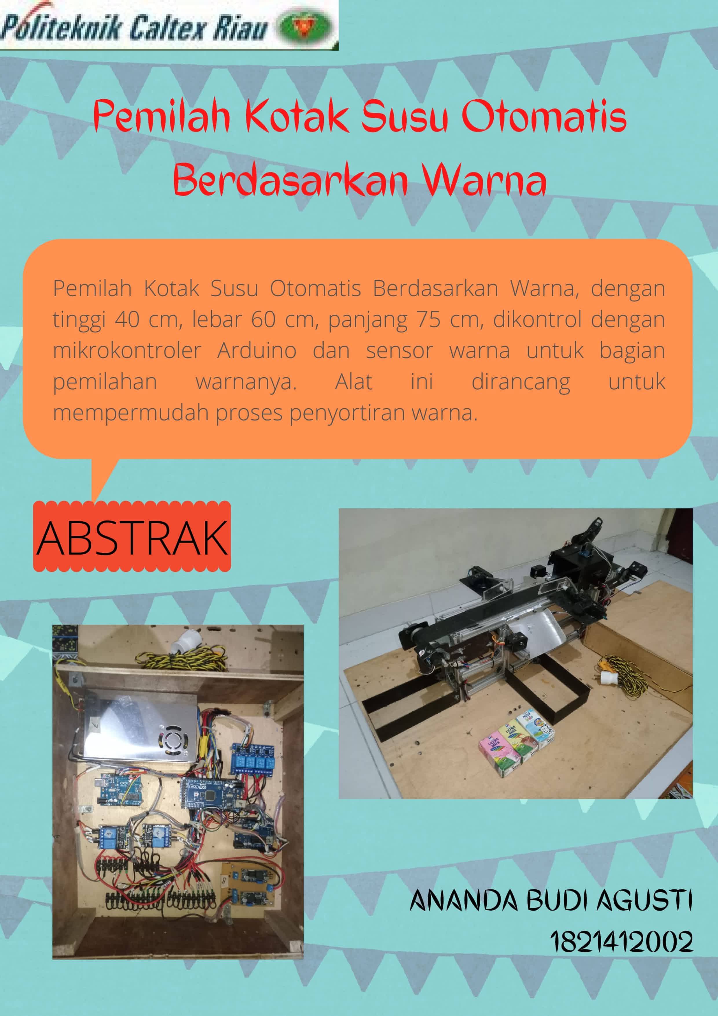 Sebuah warna produk akan menggambarkan rasa dari sebuah rasa susu. Dalam pengemasan produk akan disesuaikan dengan satu warna atau satu rasa, maka dari itu dibutuhkan proses pemilahan produk berdasarkan warna produk atau rasa produk. Belakangan ini banyak bermunculan industri yang menciptakan produk-produk berkualitas, produk-produk ini kebanyakan menggunakan kemasan seperti kardus, namun proses pemilahan warna dilakukan secara manual. Pesanan produk yang sangat banyak tentunya akan sangat merepotkan apabila proses pemilahan masih dilakukan secara manual. Maka dibuat Pemilah Kotak Susu Otomatis Berdasarkan Warna, dengan tinggi 40 cm, lebar 60 cm, panjang 75 cm, dikontrol dengan mikrokontroler Arduino dan sensor warna untuk bagian pemilahan warnanya dan ditampung di wadah yang sesuai dengan warna produk yang dideteksi sensor warna. Untuk pemilahan kotak dilakukan dengan meletakkan kotak(produk) pada konveyor yang melewati sensor warna TCS230, sehingga memisahkan susu berdasarkan warna kotak(produk) susunya. Proses berlangsung bila infrared pada tempat pendeteksi, mendeteksi adanya kotak atau produk yang akan melewati sensor warna TCS230 sesuai warna kotak susu (pink, coklat, dan biru). Jika tidak sesuai, maka kotak(produk) akan dilewatkan menuju ke kardus susu yang sesuai dengan warna kotak(produk) yang dideteksi sensor warna.Setelah dilakukan pengujian sebanyak 10 kali pengujian, pemilahan ketiga warna kotak menunjukkan tingkat keberhasilan 100%.