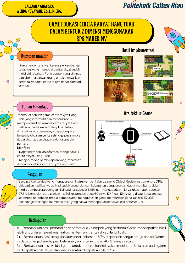 Masyarakat Indonesia terdiri atas berbagai suku bangsa dan kebudayaan. Salah satu unsur kebudayaan adalah cerita rakyat. Cerita rakyat yang dimiliki oleh masyarakat melayu salah satunya adalah cerita rakyat Hang Tuah yang menceritakan tentang tokoh legendaris Melayu. Hang Tuah sangat terkenal dengan keberanian dan kepahlawanannya. Semangatnya yang tidak kenal lelah dan pantang menyerah dalam membela bangsa patut diteladani oleh generasi muda. Namun seiring berjalannya waktu, kebudayaan semakin di lupakan oleh masyarakat. Masyarakat lebih tertarik dengan perkembangan teknologi yang semakin canggih, salah satunya adalah game. Solusi yang tepat untuk menyelesaikan permasalahan tersebut yaitu membuat cerita rakyat dalam bentuk Role Playing Game (RPG). Role Playing Game (RPG) adalah genre game yang memiliki unsur cerita yang kompleks, pemain dapat berperan dan berinteraksi langsung dengan tokoh-tokoh yang terdapat di dalam cerita. Oleh karena itu, untuk mengembalikan minat masyarakat terhadap cerita rakyat, cerita rakyat dibuat dan disajikan dalam bentuk Game RPG sehingga cerita rakyat khususnya cerita rakyat Hang Tuah tetap diminati sesuai perkembangan zaman sekarang. Berdasarkan validasi yang menggunakan instrumen penilaian Learning Object Review Instrument (LORI), didapatkan hasil bahwa aplikasi sudah sesuai dengan kebutuhan pengguna dan dapat membantu dalam media pembelajaran dengan nilai validitas sebesar 81.5% dan mendapatkan nilai validitas materi sebesar 97.5%. Kemudian berdasarkan hasil uji responden pada 60 siswa SMP dan SMA yang dibagi kedalam dua kelompok percobaan, media pembelajaran menggunakan game memberikan kenaikan nilai 57.33% dibandingkan dengan membaca buku yang hanya mendapatkan kenaikan nilai sebesar 30%.