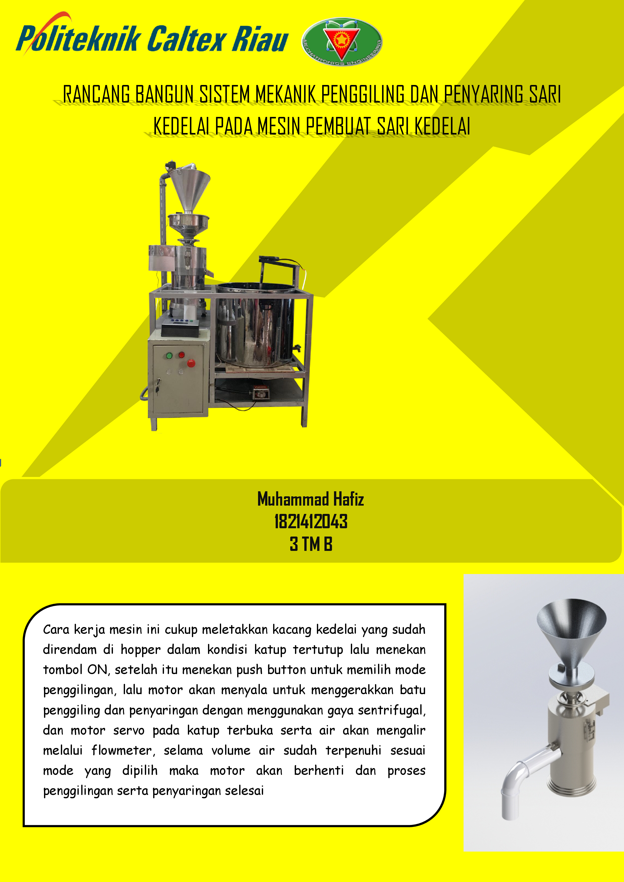 UMKM Tek Nong Soya Bangkinang merupakan salah satu produsen susu kedelai yang ada di Riau. Dalam proses penggilingan kedelai yang di lakukan oleh UMKM Tek Nong Soya masih secara tradisional yaitu diblender hingga menjadi bubur lalu disaring menggunakan kain dan dimasak, sehingga memakan waktu yang lama. Dengan menggunakan Sistem Mekanik Penggiling dan Penyaring Kacang Kedelai ini akan membantu proses penggilingan dan penyaringan untuk membuat sari kedelai dalam waktu yang lebih cepat sehinggadapat meningkatkan produksi dan keuntungan pada industri rumah tangga maupun UMKM. Cara kerja mesin ini cukup meletakkan kacang kedelai yang sudah direndam di hopper dalam kondisi katup tertutup lalu menekan tombol ON, setelah itu menekan push button untuk memilih mode penggilingan, lalu motor akan menyala untuk menggerakkan batu penggiling dan penyaringan dengan menggunakan gaya sentrifugal, dan motor servo pada katup terbuka serta air akan mengalir melalui flowmeter, selama volume air sudah terpenuhi sesuai mode yang dipilih maka motor akan berhenti dan proses penggilingan serta penyaringan selesai. Untuk proses penggilingan 1 kg kedelai dan 9 liter air yang sudah ditentukan oleh UMKM Tek Nong Soya maka didapat hasil sari kedelai dengan jumlah 9,9 liter, dengan bukaan katup pada hopper sebesar 300 sehingga air dan kedelai pada hopper habis bersamaan.