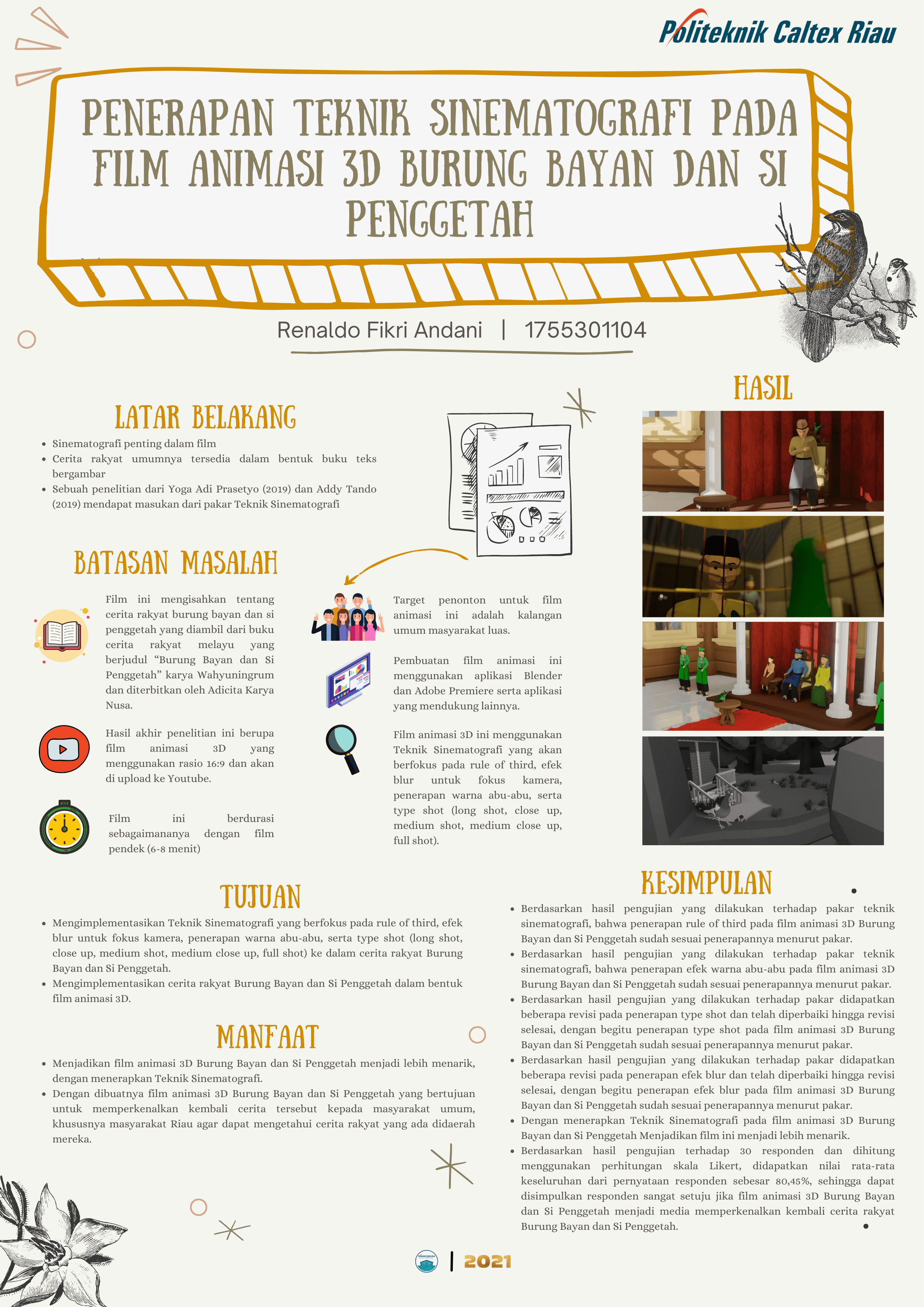 Cerita rakyat adalah cerita yang berasal dari masyarakat lampau, yang kerap diperkenalkan kepada generasi berikutnya. Salah satunya berada di Provinsi Riau yaitu Burung Bayan dan Si Penggetah. Saat ini umumnya sejarah didokumentasikan dalam bentuk buku teks yang tebal sehingga kurang menarik untuk digemari oleh pelajar, dimana jarang ditemukan cerita rakyat dalam bentuk film animasi 3D, terutama pada cerita rakyat Burung Bayan dan Si Penggetah yang tersedia dalam bentuk buku teks bergambar. Dalam penelitian ini diangkat cerita rakyat Burung Bayan dan Si Penggetah yang dikemas dalam bentuk film animasi 3D. Dalam pembuatan film animasi ini menggunakan Teknik Sinematografi yang berfokus pada rule of third, efek blur, penerapan warna abu-abu, serta type shot sehingga menghasilkan film yang lebih menarik. Berdasarkan hasil pengujian teknik yang dilakukan terhadap pakar, bahwa penerapan Teknik Sinematografi pada film animasi 3D Burung Bayan dan Si Penggetah sudah sesuai yaitu pada penerapan rule of third telah sesuai, penerapan warna abu-abu telah sesuai, penerapan efek blur telah sesuai, dan penerapan type shot telah sesuai, sehingga pada film animasi 3D ini menjadi lebih menarik untuk ditonton dengan menerapkan Teknik Sinematografi. Dan berdasarkan hasil kuesioner yang dilakukan terhadap 30 responden mendapatkan hasil 80.45% bahwa film yang dibuat dapat diperkenalkan kembali kepada masyarakat.