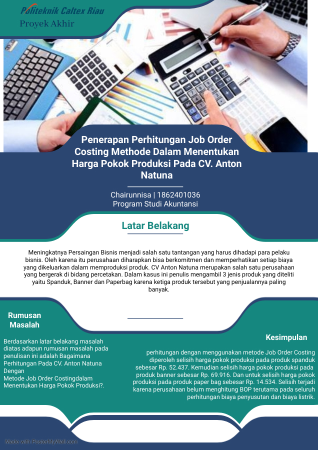 Tujuan dari penulisan ini yaitu mengetahui perhitungan harga pokok produksi dengan menggunakan metode Job Order Costing pada CV. Anton Natuna tahun 2020. Peneliatian ini merupakan penelitian deskriptif kuantitatif dengan metode penelitian dalam penelitian ini adalah dokumentasi dan wawancara. Setelah dilakukan penelitian didapat hasil harga pokok produksi untuk spanduk uk 1 x 1m sebesar Rp 54.179, spanduk uk 3 x 1m sebesar Rp 96.759, spanduk uk 4 x 1 sebesar Rp 117.779. Roll up banner uk 60cm x 160cm sebesar Rp 180.679, Roll up banner uk 80cm x 200cm sebesar Rp 193.179, X banner uk 60cm x 160cm sebesar Rp 92.679. X banner uk 80cm x 200cm sebesar Rp 105.179, Paper Bag uk 25cm x 11 cm x 30cm sebesar Rp 24.740, Paper Bag uk 31cm x 13cm x 41,5cm sebesar Rp 28.165. Berdasarkan perhitungan dengan menggunakan metode Job Order Costing diperoleh selisih harga pokok produksi pada ketiga ukuran produk spanduk sebesar Rp. 52.437. Kemudian selisih harga pokok produksi pada keempat ukuran produk banner sebesar Rp. 69.916. Dan untuk selisih harga pokok produksi pada kedua ukuran produk paper bag sebesar Rp. 14.534. Selisih terjadi karena perusahaan belum menghitung BOP terutama pada seluruh perhitungan biaya penyusutan dan biaya listrik.