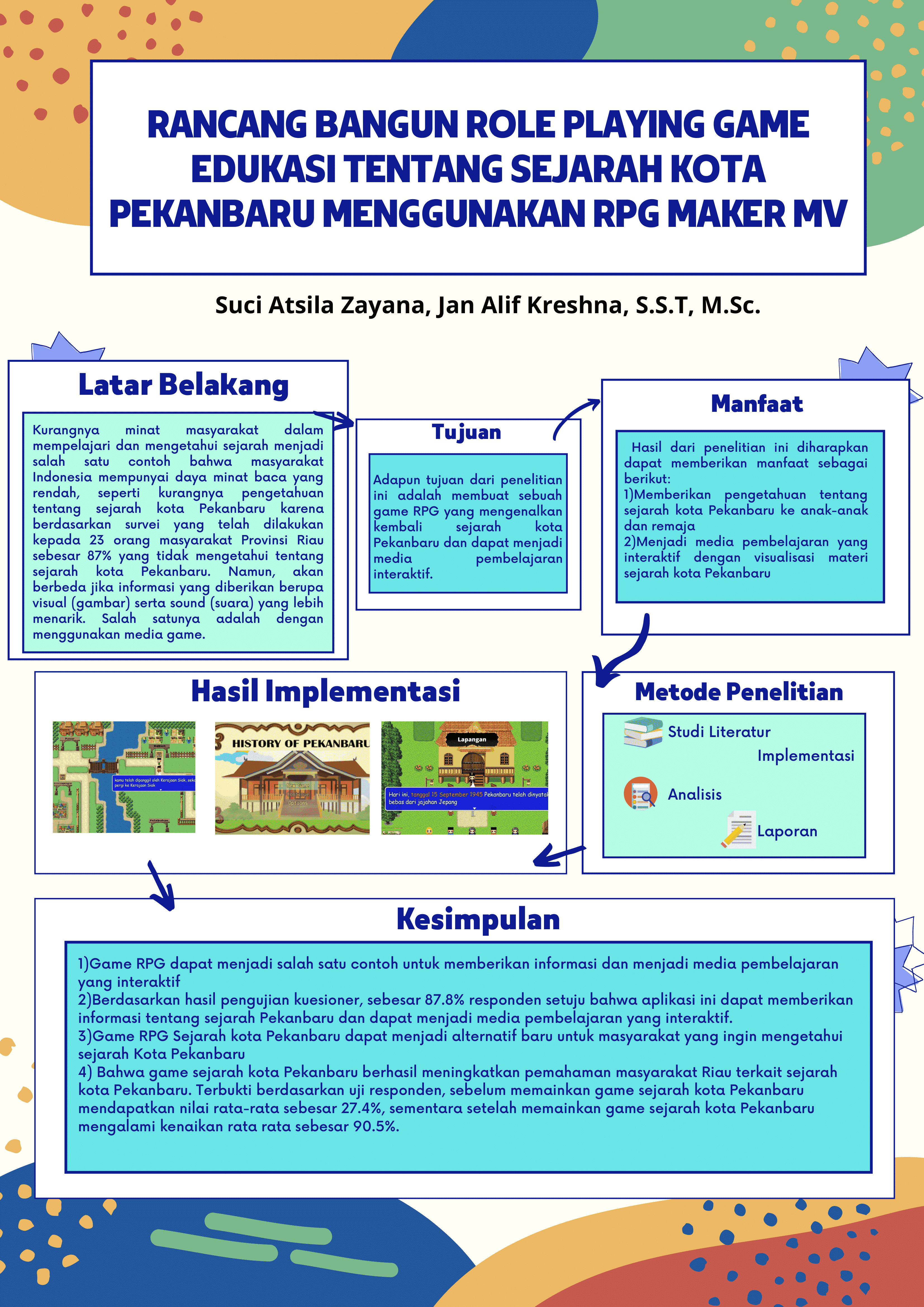 Kurangnya minat masyarakat dalam mempelajari dan mengetahui sejarah menjadi salah satu contoh bahwa masyarakat Indonesia mempunyai daya minat baca yang rendah, seperti kurangnya pengetahuan tentang sejarah kota Pekanbaru karena berdasarkan survei yang telah dilakukan kepada 23 orang masyarakat Provinsi Riau sebesar 87% yang tidak mengetahui tentang sejarah kota Pekanbaru. Namun, akan berbeda jika informasi yang diberikan berupa visual serta suara yang lebih menarik. Salah satunya adalah dengan menggunakan media game. Untuk meningkatkan pengetahuan dan memberikan informasi mengenai sejarah kota Pekanbaru, maka dibangunlah sebuah game RPG mengenai sejarah kota Pekanbaru. Aplikasi ini dibangun menggunakan aplikasi RPG Maker MV yang berbasis Android. Role Playing Game adalah sebuah permainan di mana pemainnya memainkan peran karakter dalam latar fiksi. Kisah dalam permainan ini diambil dari buku „Dari Kebatinan Senapelan Ke Bandaraya Pekanbaru‟ yang ditulis oleh Suwardi Ms, Wan Ghalib, Isjoni, Zulkarnain. Permainan ini ditujukan untuk anak-anak dan remaja dengan harapan bisa mengetahui sejarah mengenai sejarah kota Pekanbaru lebih dalam melalui game ini. Game ini telah diuji kepada 30 responden, dengan cara membandingkan dengan pretest dan posttest antara sebelum dan sesudah memainkan game, game memberikan kenaikan dengan sebesar 91.3% dibandingkan dengan sebelum memainkan game Sejarah Pekanbaru yaitu sebesar 32.2%