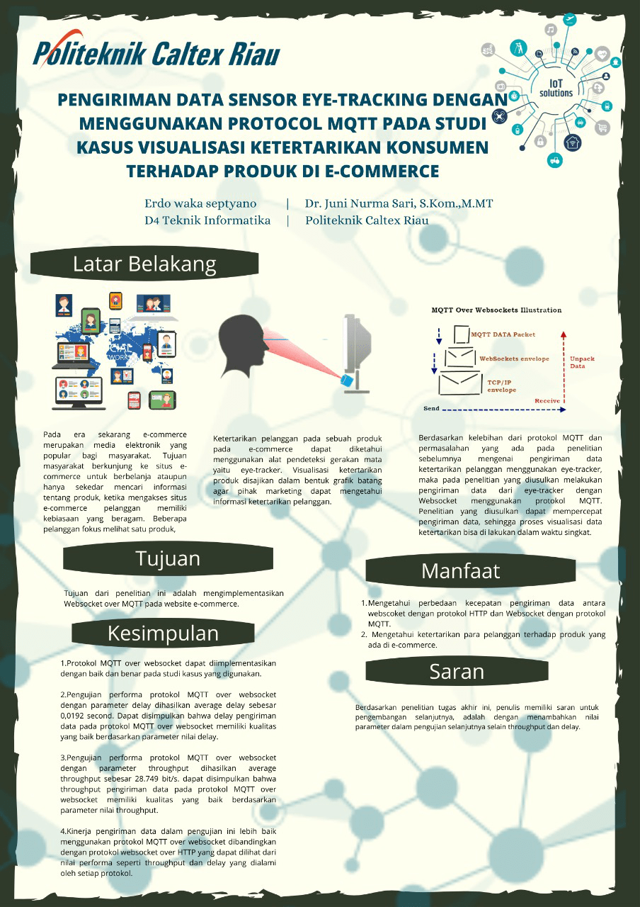 Penelitian yang dilakukan berdasarkan pada penelitian sebelumnya yang berjudul studi kasus visualisasi ketertarikan pelanggan terhadap produk E-commerce dengan metode pengukuran Eye-Tracking. Pada penelitian sebelumnya, sejak dimulai dari pengambilan data yang berupa titik koordinat mata hingga menjadi grafik membutuhkan waktu 1 sampai 2 menit. Waktu yang dibutuhkan tersebut bergantung pada jumlah data yang diperoleh ketika melakukan eksplorasi E-commerce dan banyak data yang dikirimkan. Jika pada penelitian sebelumnya menggunakan protokol Hyper Text Transfer Protocol (HTTP), maka pada penelitian ini menggunakan protokol Message Queuing Telementary Transport (MQTT). Protokol MQTT digunakan untuk mengirimkan data dari sensor Eye-Tracker ke server database. Eye-Tracker adalah sensor yang dapat menangkap gerakan mata terhadap apa yang dilihat pada layar monitor penggunanya. Sensor ini digunakan pada E-commerce yang bertujuan untuk mengetahui ketertarikan pelanggan terhadap sebuah produk. Pada penelitian ini membandingkan kinerja protokol MQTT dengan websocket dan protokol HTTP dengan websocket dalam mengirimkan data koordinat yang diperoleh dari Eye-Tracker dalam E-commerce. Dari pengujian diperoleh throughput 28,749 bit/s dan delay 0,0192 s untuk protokol MQTT dengan websocket. Pengujian protokol HTTP dengan websocket didapatkan throughput dan delay 27,6 bit/s dan 0,0222 s. Hal ini karena protokol MQTT menggunakan bandwith yang lebih rendah daripada HTTP
