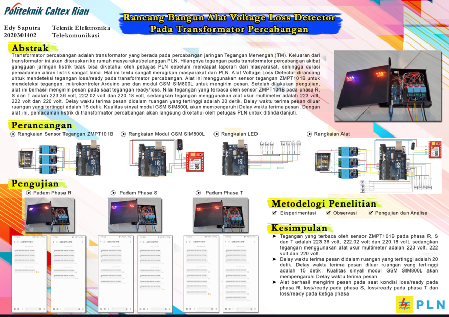 Transformator percabangan adalah transformator yang berada pada percabangan jaringan Tegangan Menengah (TM). Keluaran dari transformator ini akan diteruskan ke rumah masyarakat/pelanggan PLN. Hilangnya tegangan pada transformator percabangan akibat gangguan jaringan listrik tidak bisa diketahui oleh petugas PLN sebelum mendapat laporan dari masyarakat, sehingga durasi pemadaman aliran listrik sangat lama. Hal ini tentu sangat merugikan masyarakat dan PLN. Alat Voltage Loss Detector dirancang untuk mendeteksi tegangan loss/ready pada transformator percabangan. Alat ini menggunakan sensor tegangan ZMPT101B untuk mendeteksi tegangan, mikrokontroler Arduino uno dan modul GSM SIM800L untuk mengirim pesan. Setelah dilakukan pengujian, alat ini berhasil mengirim pesan pada saat tegangan ready/loss. Nilai tegangan yang terbaca oleh sensor ZMPT101B pada phasa R, S dan T adalah 223.36 volt, 222.02 volt dan 220.18 volt, sedangkan tegangan menggunakan alat ukur multimeter adalah 223 volt, 222 volt dan 220 volt. Delay waktu terima pesan didalam ruangan yang tertinggi adalah 20 detik. Delay waktu terima pesan diluar ruangan yang tertinggi adalah 15 detik. Kualitas sinyal modul GSM SIM800L akan mempengaruhi Delay waktu terima pesan. Dengan alat ini, pemadaman listrik di transformator percabangan akan langsung diketahui oleh petugas PLN untuk ditindaklanjuti.