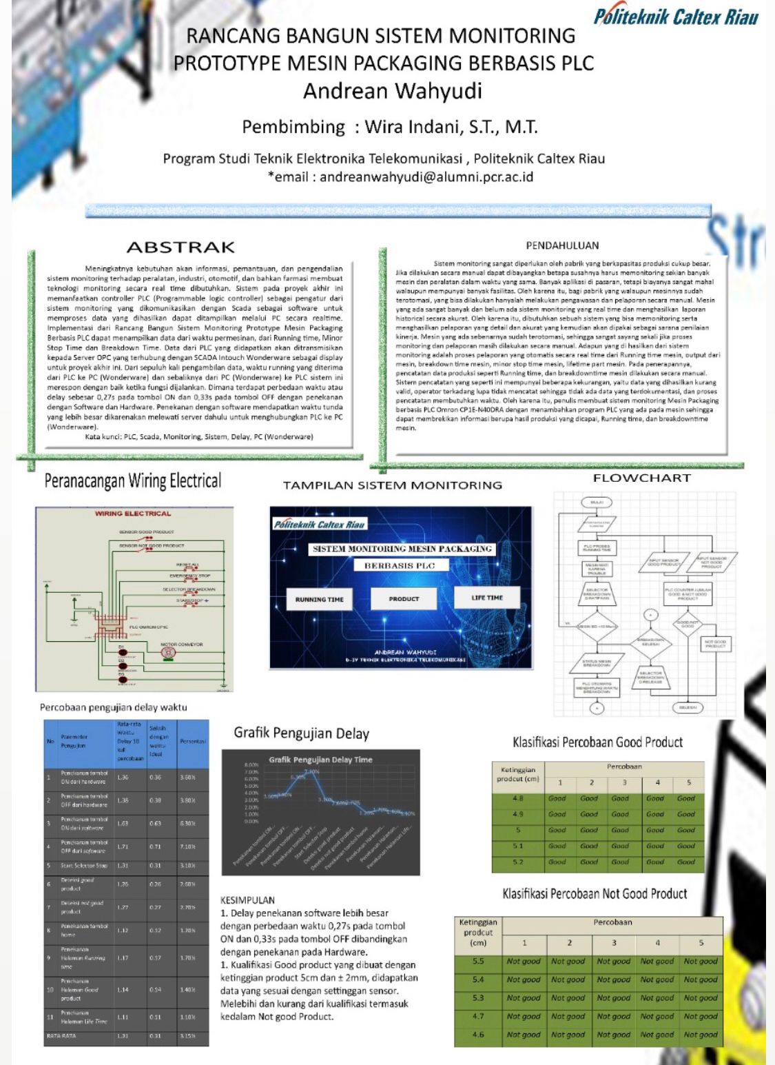 Meningkatnya kebutuhan akan informasi, pemantauan, dan pengendalian sistem monitoring terhadap peralatan, industri, otomotif, dan bahkan farmasi membuat teknologi monitoring secara real time dibutuhkan. Sistem pada proyek akhir ini memanfaatkan controller PLC (Programmable logic controller) sebagai pengatur dari sistem monitoring yang dikomunikasikan dengan Scada sebagai software untuk memproses data yang dihasilkan dapat ditampilkan melalui PC secara realtime. Implementasi dari Rancang Bangun Sistem Monitoring Prototype Mesin Packaging Berbasis PLC dapat menampilkan data dari waktu permesinan, dari Running time, Minor Stop Time dan Breakdown Time. Data dari PLC yang didapatkan akan ditransmisikan kepada Server OPC yang terhubung dengan SCADA Intouch Wonderware sebagai display untuk proyek akhir ini. Dari sepuluh kali pengambilan data, waktu running yang diterima dari PLC ke PC (Wonderware) dan sebaliknya dari PC (Wonderware) ke PLC sistem ini merespon dengan baik ketika fungsi dijalankan. Dimana terdapat perbedaan waktu atau delay sebesar 0,27s pada tombol ON dan 0,33s pada tombol OFF dengan penekanan dengan Software dan Hardware. Penekanan dengan software mendapatkan waktu tunda yang lebih besar dikarenakan melewati server dahulu untuk menghubungkan PLC ke PC (Wonderware).