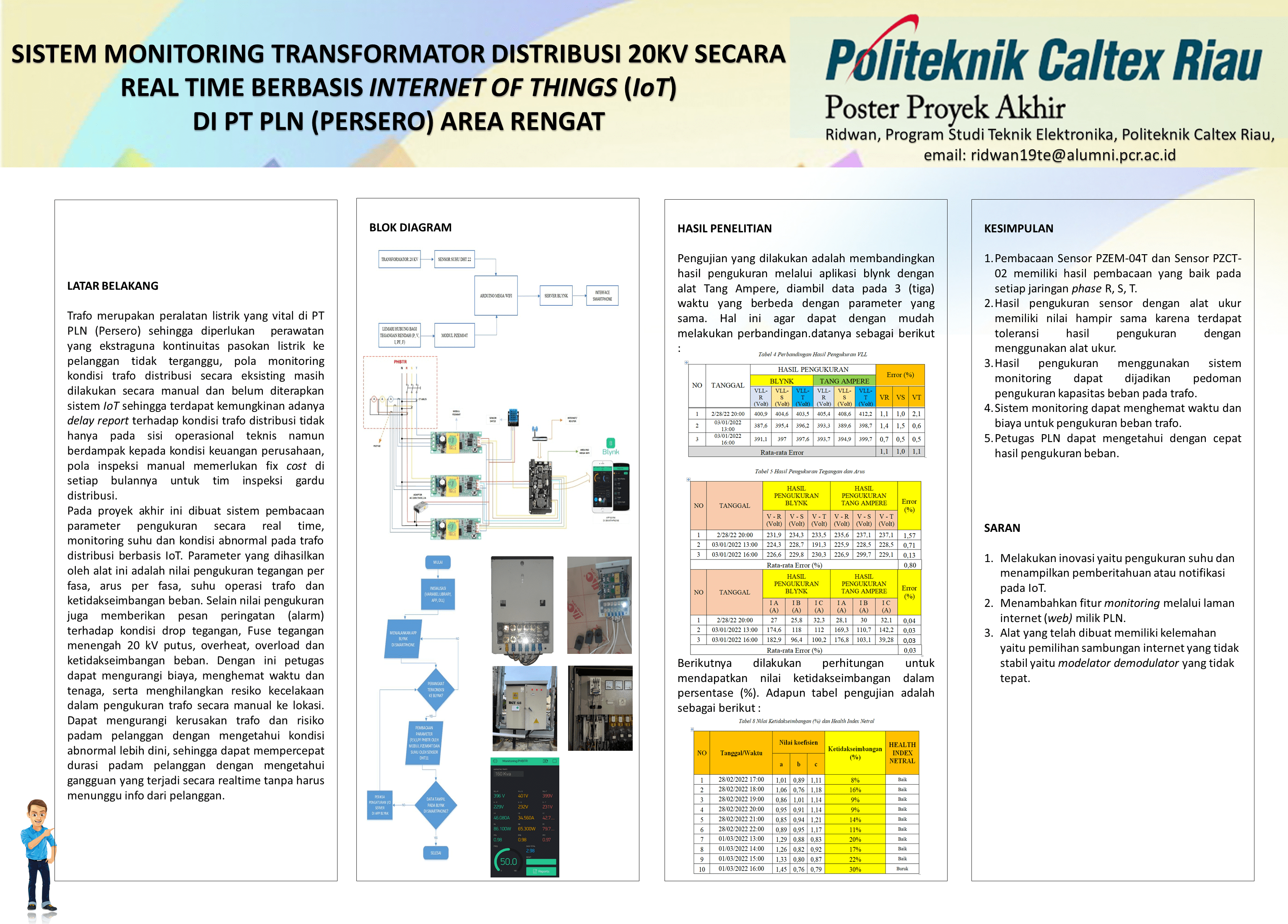 Sistem monitoring Transformator Distribusi 20kV secara real time berbasis Internet of Things (IoT) adalah alat yang dapat memonitoring tegangan, arus, dan beban di gardu secara real time. Alat ini di aplikasikan pada Perusahaan Listrik Negara (PLN) untuk area kerja kota Rengat, Riau. Alat dapat menganalisa pembebanan trafo distribusi yang dimiliki PLN secara otomatis dan dapat dipantau melalui gawai (gadget). Sebab pada saat ini, pembebanan trafo distribusi PLN dianalisa secara manual dalam jangka waktu dalam 6 (enam) bulan sekali, hal ini membuat PLN kesulitan memonitoring penambahan beban pada trafo distribusi. Sehingga dibuat alat yang mampu menganalisa pembebanan pada gardu secara otomatis. Alat yang dirancang menggunakan NodeMCU sebagai kontroler, 3 (tiga) buah Sensor tegangan PZEM-04T dengan mengambil tegangan dari tegangan PHB-TR, 3 (tiga) buah Sensor arus PZCT-02 dengan mengambil Sekunder CT yang terpasang di gardu, dan Adaptor AC-DC 220V-5V. Sensor yang dipasang program menggunakan Arduino IDE dan parameter yang terbaca dapat langsung masuk ke database Blynk. Sehingga, data yang dibaca oleh PZEM-04T dan PZCT-02 dapat tampil secara real time pada gawai dengan bantuan Modulator Demodulator (Modem) untuk mengirimkan data secara online. Persentase Error dari hasil perbandingan pengukuran dilapangan dan dari applikasi Blynk didapat error pada sensor tegangan yaitu 0.008% dan error pada sensor arus adalah 0.035%. Sedangkan untuk nilai ketidakseimbangan rata-rata adalah bernilai 16% dengan kategori ketidakseimbangan cukup. Secara fungsional, alat ini dapat menampilkan data real time yang dibutuhkan untuk menganalisa kapasitas gardu distribusi setiap waktu, sehingga PLN dapat langsung menindaklanjuti dengan cepat bila ada pelanggan yang akan menambah beban.