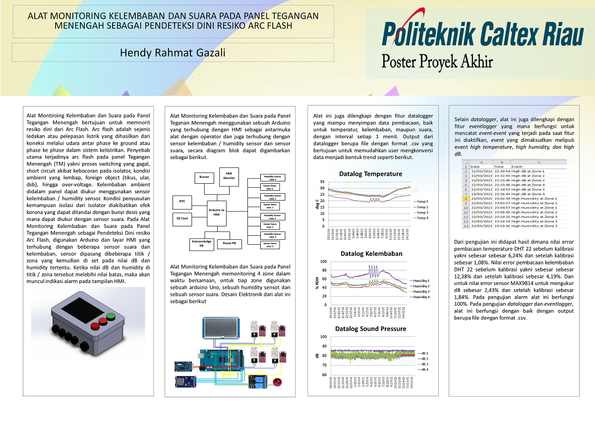 Arc flash adalah sejenis ledakan atau pelepasan listrik yang dihasilkan dari koneksi melalui udara antar phase ke ground atau phase ke phase dalam sistem kelistrikan. Penyebab utama terjadinya arc flash pada panel Tegangan Menengah (TM) yakni proses switching yang gagal, short circuit akibat kebocoran pada isolator, kondisi ambient yang lembab, foreign object (tikus, ular, dsb), hingga over-voltage. Kelembaban ambient didalam panel dapat diukur menggunakan sensor kelembaban / humidity sensor. Kondisi penyusutan kemampuan isolasi dari isolator diakibatikan efek korona yang dapat ditandai dengan bunyi desis yang mana dapat diukur dengan sensor suara. Pada Alat Monitoring Kelembaban dan Suara pada Panel Tegangan Menengah sebagai Pendeteksi Dini resiko Arc Flash, digunakan sebuah Arduino dan HMI Nextion yang terhubung dengan beberapa 4 buah sensor DHT 22 sebagai sensor temperature sekaligus kelembaban dan 4 buah Sensor MAX9814 sebagai sensor suara, sensor dipasang di 4 titik / zona yang kemudian diatur pada nilai dB dan humidity tertentu. Dari hasil pengujian didapat nilai error rata-rata untuk sensor temperature sebesar 0.68%, sensor kelembaban sebesar 2.73%, dan sensor suara sebesar 2.45%. Pada pengujian simulasi alat, alarm bekerja 100% ketika parameter ukur melewati set point. Fitur datalogger dan eventlogger pada alat juga berfungsi dengan baik dengan output file berformat “.csvâ€.