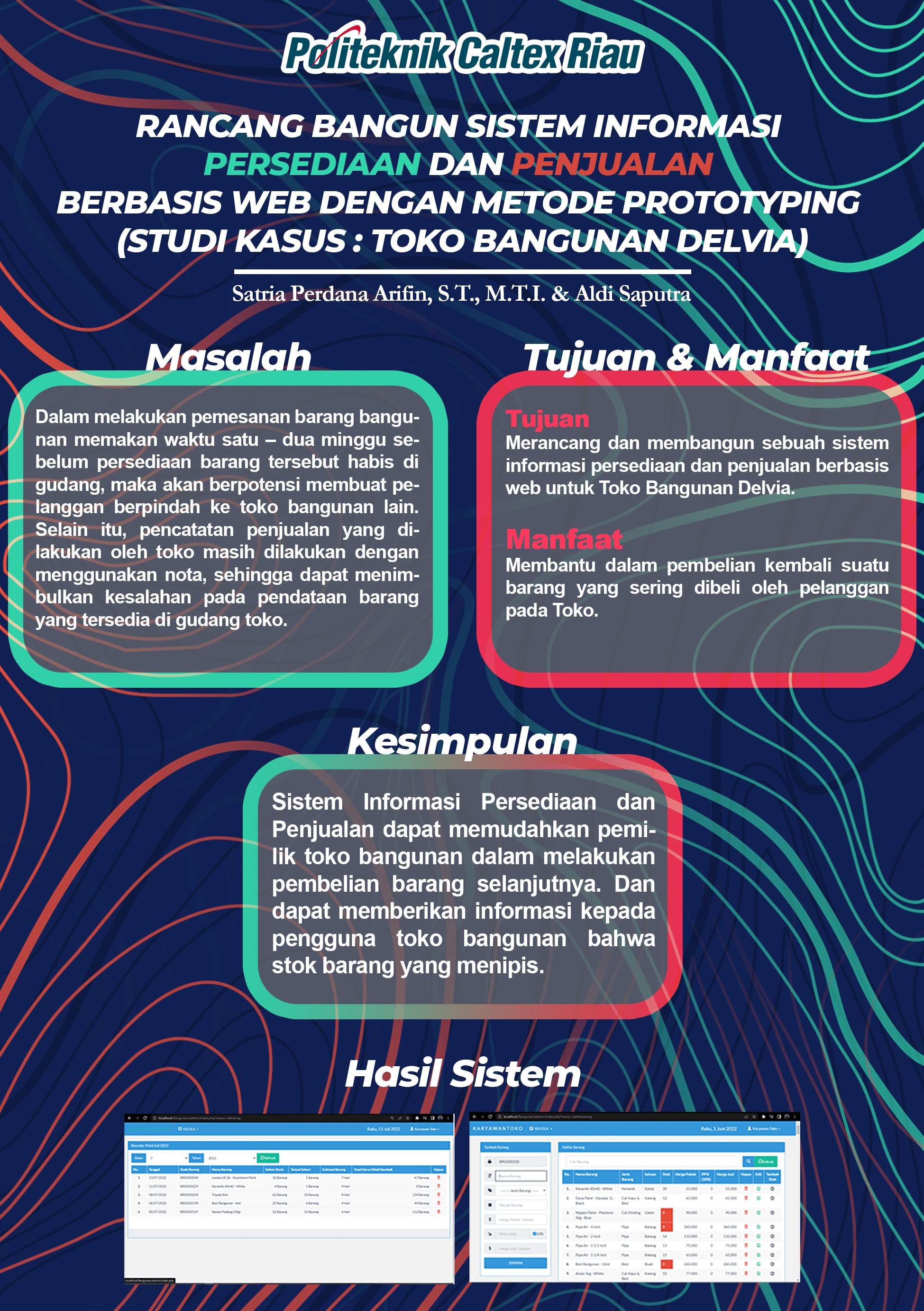 Toko Bangunan Delvia merupakan sebuah usaha yang bergerak dalam bidang penjualan bahan bangunan dan perlengkapan dalam pembuatan bangunan. Toko Bangunan Delvia menjual berbagai bahan dan perlengkapan untuk membuat bangunan. Toko Bangunan Delvia dalam melakukan pendataan data barang yang dipesan melalui supplier masih menggunakan nota yang diberikan oleh supplier, toko juga memiliki supplier untuk persediaan barang, dalam melakukan pemesanan barang tersebut memakan waktu paling lambat satu – dua minggu sebelum persediaan barang habis. Setelah barang yang telah dipesan sudah sampai di toko, maka barang tersebut akan disimpan ke gudang dan karyawan toko melakukan pembayaran kepada supplier, persediaan barang dan nota yang diberikan supplier tersebut disimpan ke dalam dokumen, sehingga sering terdapatnya kesalahan yang menyebabkan terjadinya kelebihan dan kekurangan persediaan barang, untuk mengatasi hal tersebut maka akan digunakan metode Reorder Point (ROP). Sistem akan dikembangkan dengan menggunakan bahasa pemrograman Hypertext Preprocessor (PHP), dan MySQL sebagai database dan untuk mengembangkan sistem ini akan menggunakan metode prototyping. Dengan dikembangkannya Sistem Informasi Persediaan dan Penjualan berbasis web ini, diharapkan dapat membantu pihak toko dalam melakukan pencatatan, pengecekan, dan laporan secara komputerisasi sehingga lebih efektif dan efisien. Bedasarkan pengujian yang telah dilakukan, hasil yang didapat dari pengujian yang telah dilakukan, hasil untuk pengujian blackbox testing adalah seluruh dari fungsionalitas dari sistem sudah berhasil dan berjalan dengan baik berdasarkan fungsi masing - masing. User Acceptance Testing (UAT) bahwa sistem yang dibangun telah sesuai dengan kebutuhan toko dan permintaan dari pengguna, serta fungsionalitas sistem sudah berjalan dengan baik.