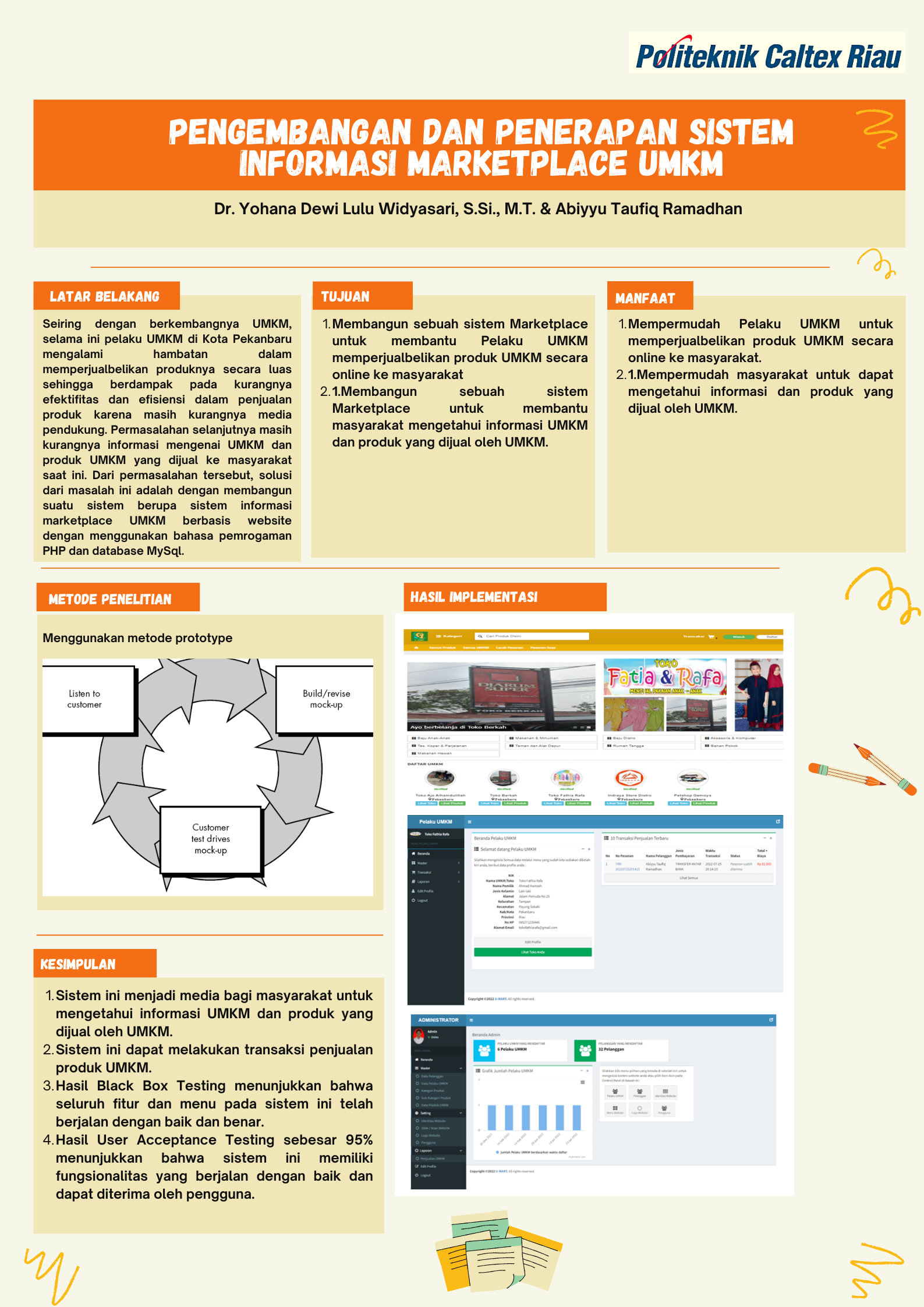 Usaha Mikro Kecil Menengah (UMKM) memegang peranan yang besar dalam memajukan perekonomian di Indonesia. UMKM adalah suatu bentuk usaha kecil masyarakat atau badan usaha yang berdiri atas inisiatif seseorang. UMKM berkembang dengan sangat pesat dan memiliki peranan penting bagi perekenomian. Kendala utama yang dihadapi pelaku UMKM adalah adanya hambatan dalam melakukan penjualan produk secara luas sehingga berdampak pada kurangnya efektif dan efisiensi proses penjualan yang dilakukan. Permasalahan lainnya yaitu masih kurangnya informasi ke masyarakat mengenai UMKM dan produk UMKM yang dijual saat ini. Berdasarkan permasalahan yang ada, maka dibangunlah sebuah sistem informasi Marketplace UMKM yang dapat menjadi media memperjualbelikan produk UMKM secara online. setiap UMKM yang telah mendaftar pada marketplace dapat mengelola UMKMnya masing-masing. Pemilik marketplace dapat memiliki sistem yang dapat mendata UMKM. Sistem ini dibangun menggunakan PHP (Hypertext Processor) sebagai bahasa pemrogaman dan MySQL sebagai database. Pengembangan sistem dilakukan dengan menggunakan metode prototyping dalam 3 kali iterasi. Hasil dari iterasi prototyping telah diimplementasikan dengan baik dalam pembangunan sistem. Hasil pengujian black box testing menyatakan bahwa sistem berjalan dengan baik. Hasil pengujian UAT 95% untuk menilai sistem ini memiliki fungsionalitas yang berjalan dengan baik dan dapat diterima oleh pengguna.