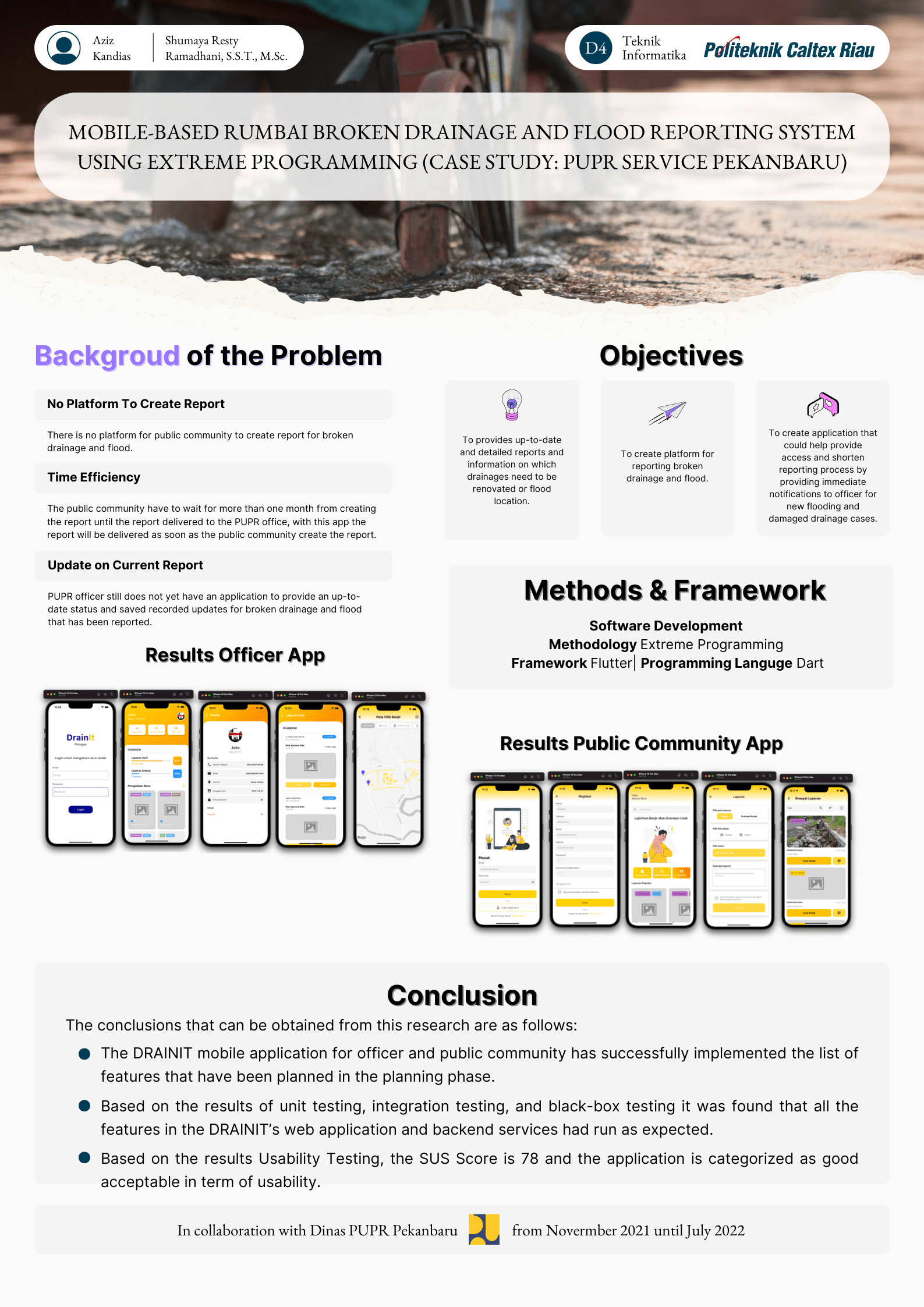 Floods and broken drainage in Pekanbaru are often experienced by the community, but only a few people report these cases by reporting directly to the RT/RW which takes a long time because they must report the cases with official letter. Besides that, most people do not know where and how to report cases of flooding and broken drainage. On the other hand, PUPR handles, and updates report through internal WhatsApp group so that report updates are not stored in a structured way and public community cannot see the updates directly. Because of the problem above a system is needed to handle the problem, the system that is going to be created implemented extreme programming methodology and built with flutter for fastest development that covering both IOS and Android devices and expected to facilitate easy access and speeds up the process for creating reports from the public community and the PUPR officer to flood or broken drainage and could provide and record up-to-date data and status of the reports. Based on the results of testing, it was unit, integration and black box testing found that the functionality of the system was going well. Then, for usability testing with the SUS method, the results were 78 and it can be concluded that the system that has been created is categorize as good acceptable and it can help public community to simply create flood and broken drainage report also provide the up-to-date report of submitted report.