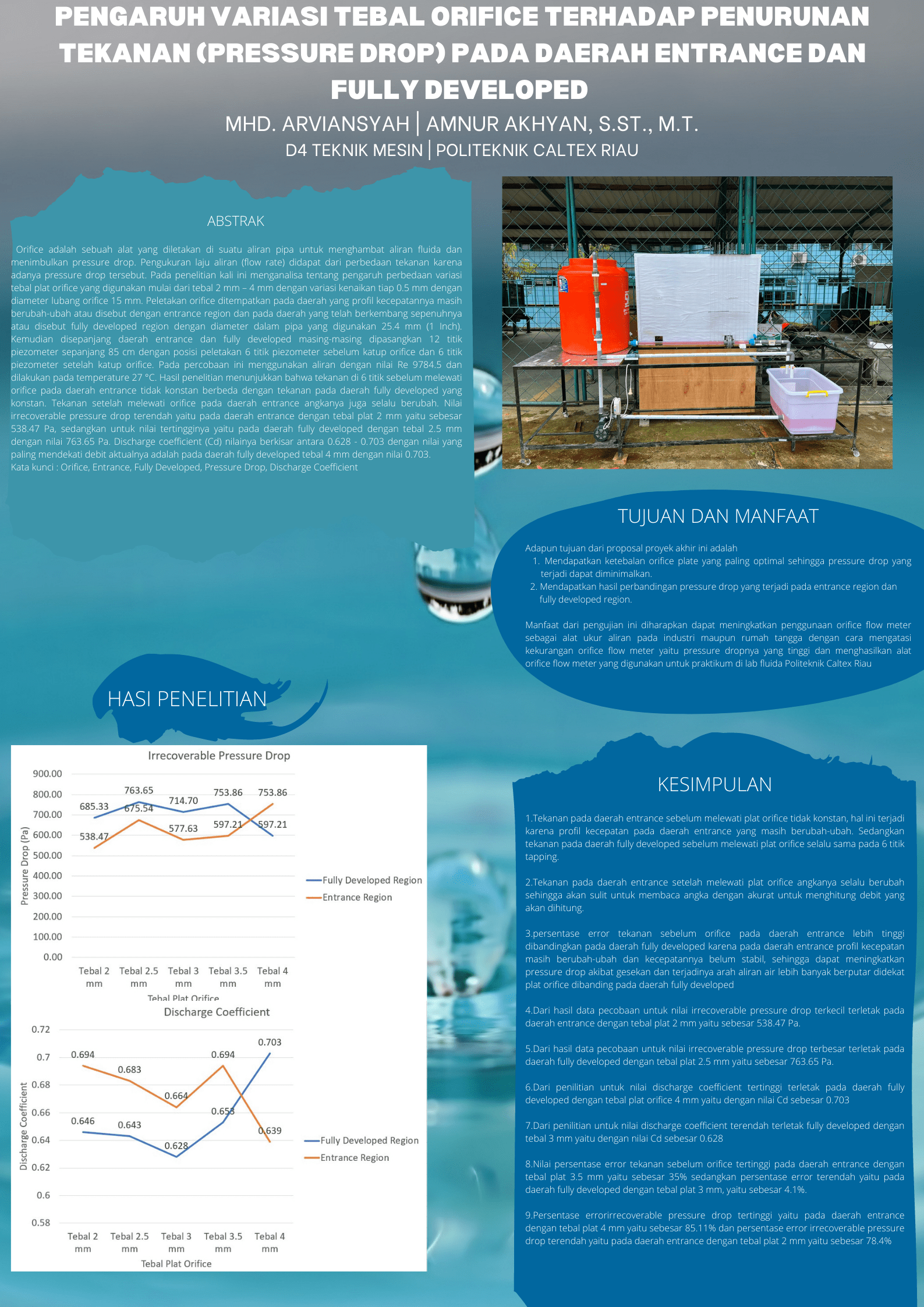 Kata kunci : Orifice, Entrance, Fully Developed, Pressure Drop, Discharge Coefficient