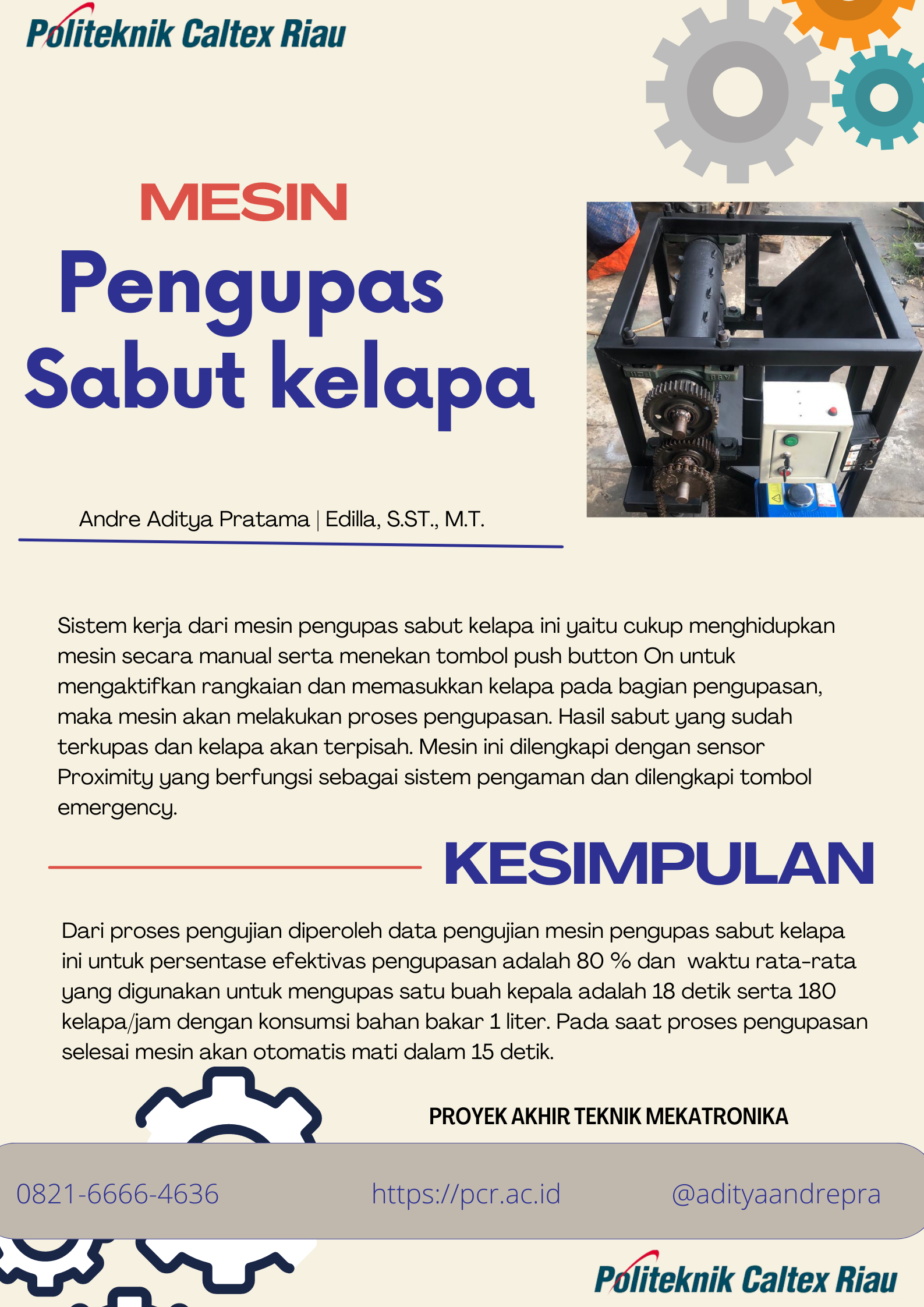 Buah kelapa merupakan tanaman yang berjenis ukuran besar, tanaman kelapa banyak terdapat di daerah beriklim tropis. Pengupasan sabut kelapa secara manual menggunakan tonggak pisau besi (suluh) kurang efektif karena masih menggunakan tenaga manusia sebagai sumber tenaga utama dan kapasitas kerja yang kecil serta memiliki resiko kerja yang tinggi. Adapun tujuan tugas akhir ini adalah untuk merancang dan membuat sebuah mesin pengupas sabut kelapa dengan proses mengupas menggunakan mata pisau yang berbentuk silinder serta dapat mati secara otomatis sehingga diharapkan hasil yang lumayan bersih dan aman. Mesin pengupas kelapa ini dapat mati secara otomatis merupakan pengembangan dari alat tradisional dan manual. Walaupun mesin ini sudah termasuk yang semi otomatis tapi penggunaanya masih menggunakan tenaga manusia untuk memasukkan kelapa ke dalam mesin. Mesin pengupas sabut kelapa dapat membantu pekerjaan pengupasan sabut menjadi lebih cepat dengan kapasitas kerja yang besar jika dibandingkan dengan pengupasan sabut kelapa secara tradisional. Hasil yang didapat dari percobaan mesin pengupas sabut kelapa dengan berbagai ukuran kelapa rata-rata 68.75%.