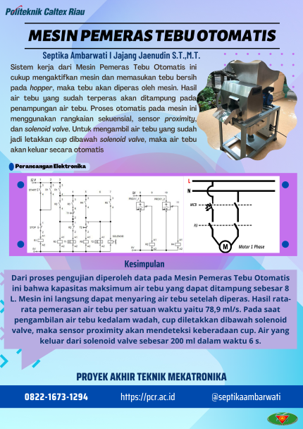 Batang tebu mengandung air yang digunakan untuk membuat minuman segar. Air tebu diambil dengan cara diperas menggunakan mesin pemerasan. Untuk mesin yang dibuat, hopper dirancang untuk menampung batang tebu dengan ukuran 60 cm sebanyak 5 kg didalamnya. 1 batang tebu dengan ukuran 2,5 meter dapat menghasilkan 10 gelas air tebu dengan ukuran 200 ml pergelasnya. Dengan adanya mesin baru dapat menghasilkan air tebu yang lebih maksimal. Mesin pemeras yang ada saat ini masih belum efisien. Perlu inovasi baru agar pemerasan tebu lebih maksimal. Pada proyek akhir ini, desain dan pemerasan roll diatur sedemikian rupa agar tebu dapat diperas hingga benar-benar kering. Secara umum, cara kerja mesin ini adalah dengan memasukkan tebu kedalam wadah yang sudah disediakan pada mesin. Selanjutnya tebu diperas dengan menggunakan roll yang digerakkan oleh motor 1 fasa. Air tebu yang sudah diperas kemudian tersaring dan ditampung pada wadah yang disediakan. Mesin ini dilengkapi dengan sistem otomatis pada bagian penyaringan serta pengambilan hasil perasan. Jika ingin mengambil air tebu yang sudah jadi, maka tinggal meletakkan cup dengan ukuran gelas 400 ml. Air akan keluar secara otomatis dengan bantuan sensor proximity. Hasil yang didapat dari pengujian pada mesin pemeras tebu otomatis yaitu rata – rata air tebu yang didapat per satuan waktu sebesar 78,9 ml/s.