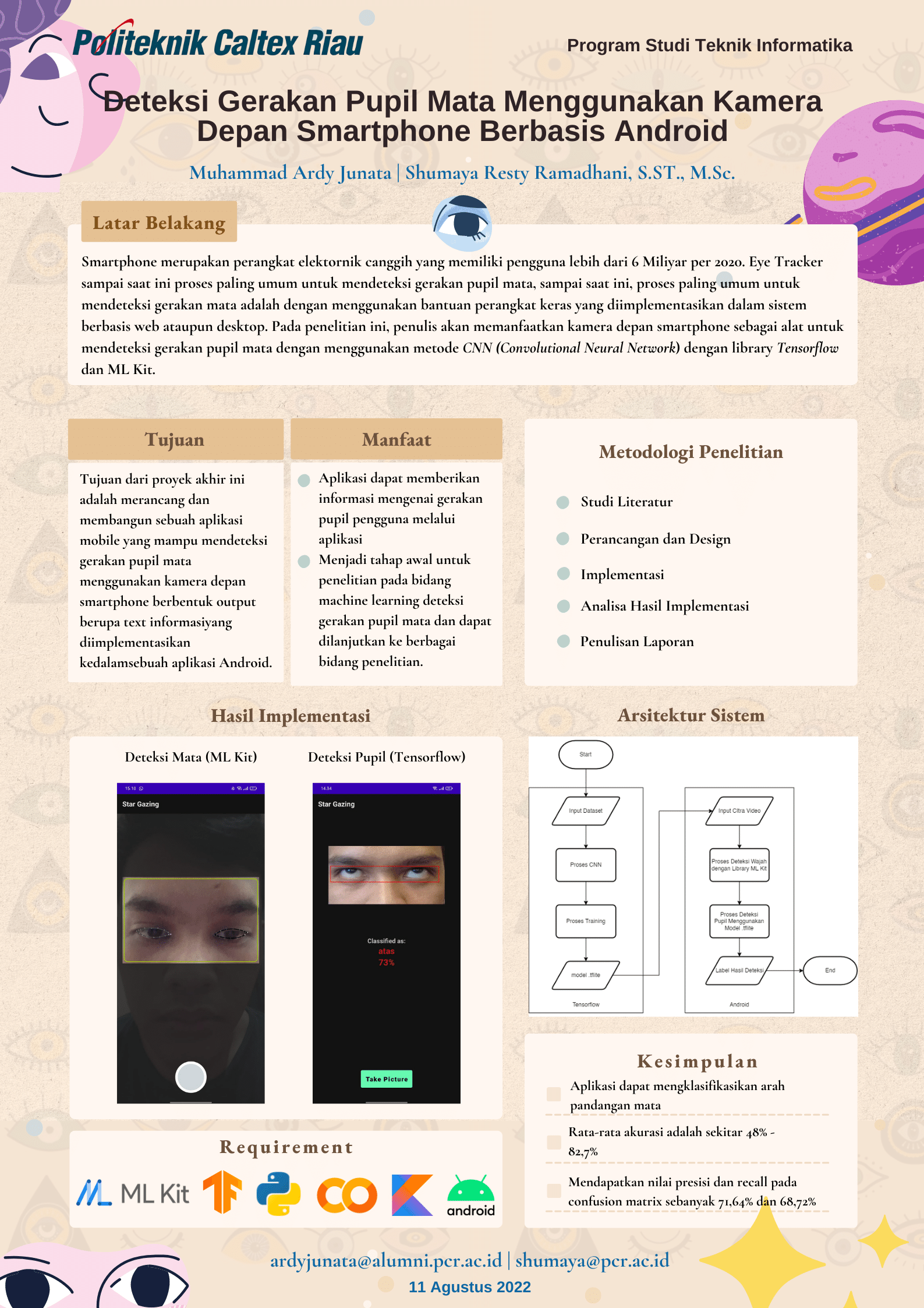 Kamera depan smartphone pada saat ini banyak digunakan oleh pengguna untuk selfie, video call, dan teleconference. Penelitian ini memanfaatkan kamera depan smartphone untuk melakukan proses deteksi gerakan pupil mata pengguna. Proses deteksi gerakan pupil mata selama ini banyak diimplementasikan menggunakan perangkat keras atau berbasis desktop dan website. Untuk melakukan implementasi Machine Learning pada perangkat smartphone. Oleh karena itu penelitian ini menggunakan library ML Kit untuk mendukung implementasi Machine Learning pada perangkat smartphone. Selain itu penelitian ini menggunakan Convolutional Neural Network (CNN) yang merupakan salah satu arsitektur dari Deep Learning untuk mendapatkan tingkat keberhasilan deteksi gerakan pupil mata yang tinggi. Proses traning model memperoleh nilai AP50(IoU 0.50) sebesar 89%. IoU digunakan untuk mengukur akurasi bounding box pada deteksi. Pada pengujian menggunakan confusion matrix menghasilkan nilai rata-rata akurasi pada setiap kelas sebesar 68,8%. Pengujian pada pengguna menggunakan jarak dan resolusi kamera sebagai parameter dengan jarak 15 cm, 20 cm, dan 25 cm yang memiliki masing-masing rata-rata akurasi sebesar 71%, 60%, dan 51%. Penelitian ini mampu menghasilkan aplikasi yang dapat mendeteksi posisi pupil mata.
