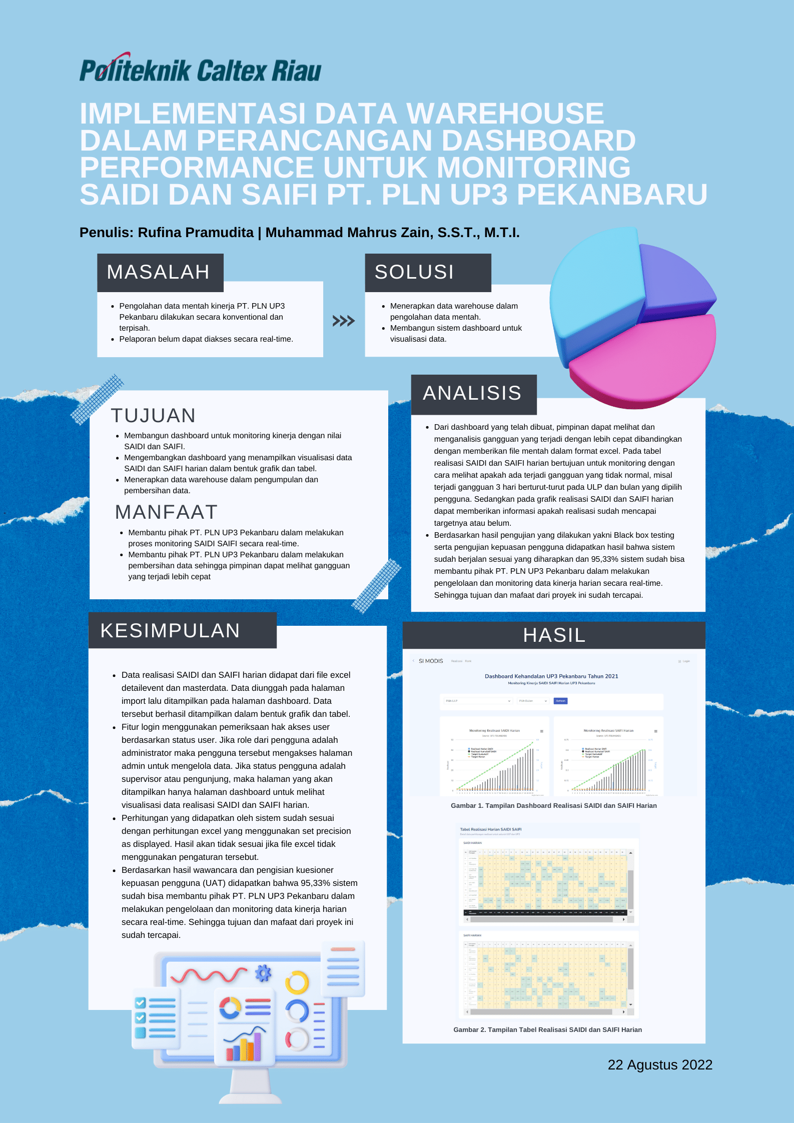PT. PLN (Persero) merupakan BUMN yang memiliki beberapa unit salah satunya terdapat Unit Pelaksana Pelayanan Pelanggan (UP3). Dalam monitoring kinerja secara bulanan, mingguan maupun harian, PT. PLN UP3 Pekanbaru memiliki masalah yaitu sulitnya mengolah data-data yang didapatkan sehingga pegawai kesulitan dalam melakukan pelaporan. Pengolahan data ini dilakukan dan dipegang oleh satu orang pegawai saja. Ketergantungan terhadap satu orang tersebut juga menjadi kendala pada proses monitoring tiap harinya, sehingga update dan akses data menjadi tidak real-time. Adapun aplikasi yang digunakan saat ini hanya dapat menampung data saja dan belum memiliki dashboard. Penelitian ini menggunakan data warehouse untuk pengumpulan data. Dashboard ini akan dibangun menggunakan bahasa pemrograman PHP dan database MySQL. Adapun hasil penelitian ini adalah sistem data warehouse yang dapat melakukan pengolahan data dan sebuah dashboard yang memvisualisasikan data SAIDI (System Average Interruption Duration Index) dan SAIFI (System Average Interruption Frequency Index) harian. Berdasarkan hasil implementasi dan pengujian yang dilakukan yaitu Black Box Testing menunjukkan bahwa sistem sudah dapat berjalan sesuai yang diharapkan. Pada pengujian kesesuaian rumus didapatkan bahwa hasil dari perhitungan secara manual sudah sesuai dengan perhitungan dengan menggunakan rumus Excel dan sistem. Adapun berdasarkan hasil pengujian User Acceptance Test yang telah dilakukan dapat disimpulkan bahwa 95,33% sistem sudah bisa membantu pihak PT. PLN UP3 Pekanbaru baik itu administrator maupun supervisor dalam melakukan monitoring dan pengelolaan data kinerja sebagai laporan secara real-time.
