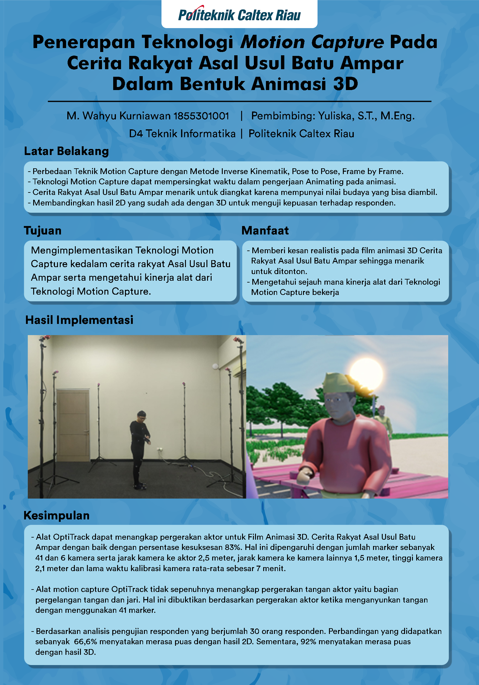 Dalam pembuatan animasi terdapat beberapa metode diantaranya Inverse Kinematik, Pose to Pose, Motion Capture dan Frame by Frame. Pada metode-metode tersebut terdapat beberapa kelemahannya, salah satunya terkait dengan efisiensi waktu dalam pengerjaannya yang cenderung panjang dan lama. Motion capture dapat mempersingkat waktu pengerjaannya, hanya dengan merekam gerakan aktor menggunakan OptiTrack, hanya dengan merekam gerakan aktor menggunakan OptiTrack yang dimana aktor akan menggunakan alat motion suit dengan beberapa marker motion yang melekat pada motion suit lalu dihubungkan dengan aplikasi Motive agar rekaman gerakan dapat diimplementasikan. Asal Usul Batu Ampar menarik untuk diangkat sebagai studi kasus karena pesan-pesan yang disampaikan memiliki nilai budaya positif yang bisa diambil oleh masyarakat. Berdasarkan penelitian ini, didapatkan bahwa alat OptiTrack telah mampu menangkap gerakan aktor dengan baik. Hal ini dipengaruhi oleh 1 set marker sebanyak 41, 6 kamera dengan jarak kamera ke aktor 2,5 meter dan waktu kalibrasi kamera selama 7 menit. Hasil dari penerapan teknologi motion capture ini mengeluarkan output Film Animasi 3D Cerita Rakyat Asal Usul Batu Ampar dengan akurasi gerakan sebesar 83%. Berdasarkan hasil dari pengumpulan kuisioner, terdapat 87,3% yang setuju bahwa Film Animasi 3D Cerita Rakyat Asal Usul Batu Ampar sudah terkesan realistis.