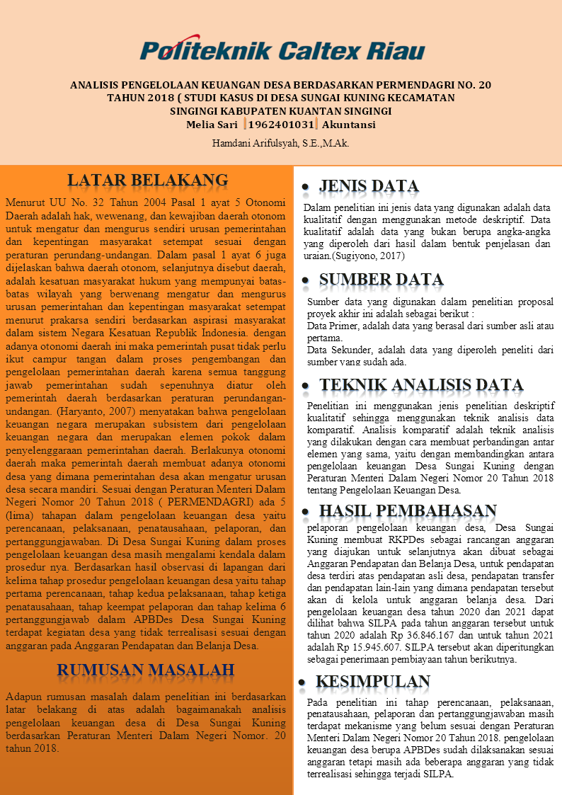 Analisis Pengelolaan Keuangan Desa Berdasarkan Permendagri No. 20 Tahun 2018 (Studi Kasus di Desa Sungai Kuning Kecamatan Singingi Kabupaten Kuantan Singingi)
