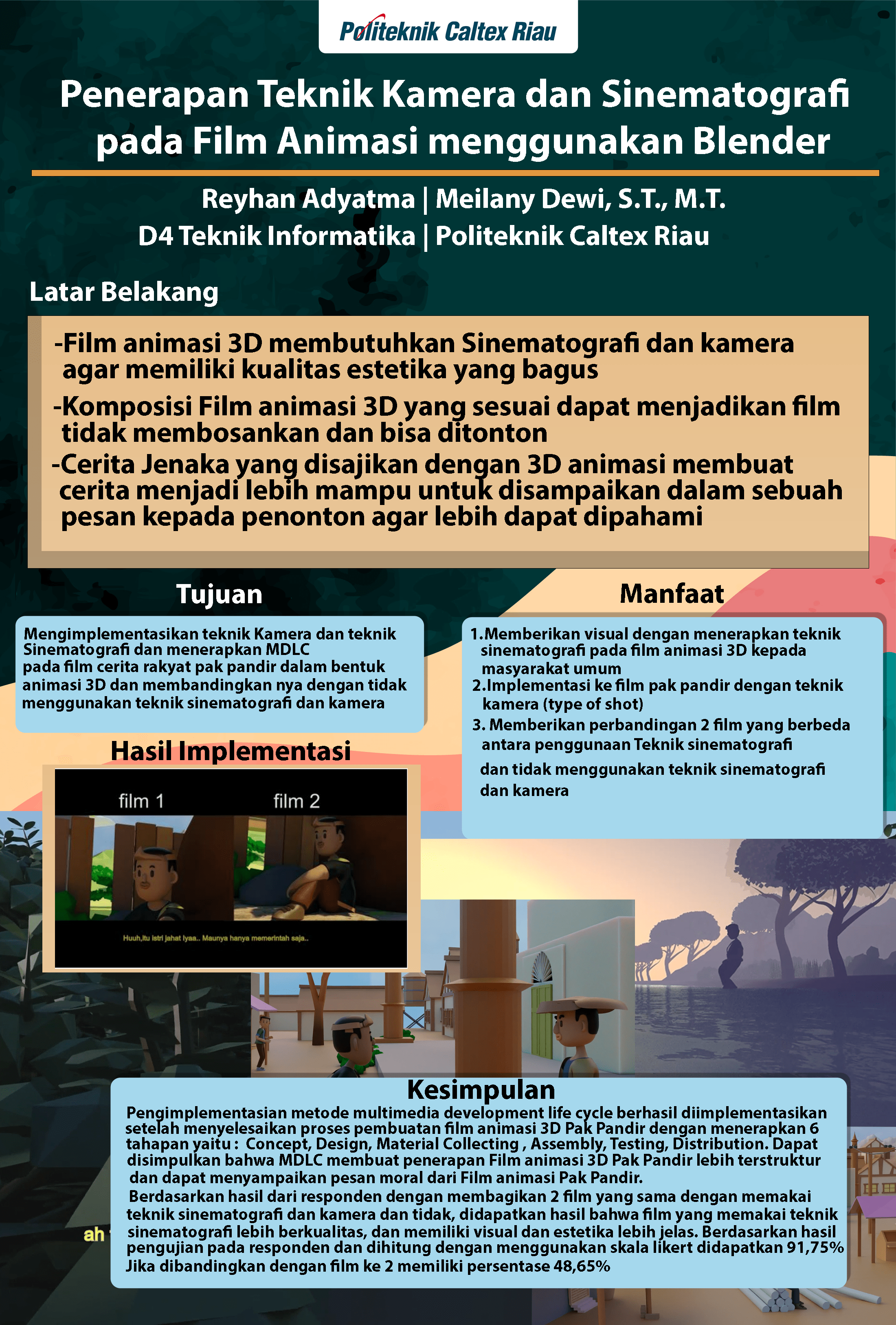 Sinematografi merupakan penggabungan dari kata Yunani dengan arti “gerakan merekam†dengan tujuan menangkap gambar serta menyatukan nya menjadi beberapa gambar dan Teknik kamera itu memberikan angle yang pas dalam membuat suatu tangkapan gambar. Pada penelitian ini menggunakan film animasi 3D tentang cerita Pak Pandir. Dimana pada setiap scene dan take,diberikan Teknik sinematografi juga kamera. Dari hasil yang didapatkan, penggunaan Teknik sinematografi dan kamera lebih berkualitas dibandingkan dengan tidak memakai sinematografi dan Teknik kamera. Dari penelitian ini didapatkan output film animasi 3D Pak Pandir yang sudah memiliki alur cerita yang jelas. Hal tersebut didukung oleh data kuesioner yang dimana sebanyak 91,7% sangat setuju dengan adanya penerapan Teknik sinematografi dan kamera akan lebih berkualitas dibandingkan dengan tidak memakai sinematografi dan kamera . Dari film animasi 3D tersebut didapatkan bahwa responden berpendapat tidak boleh menjadi orang yang mau dibodohi.