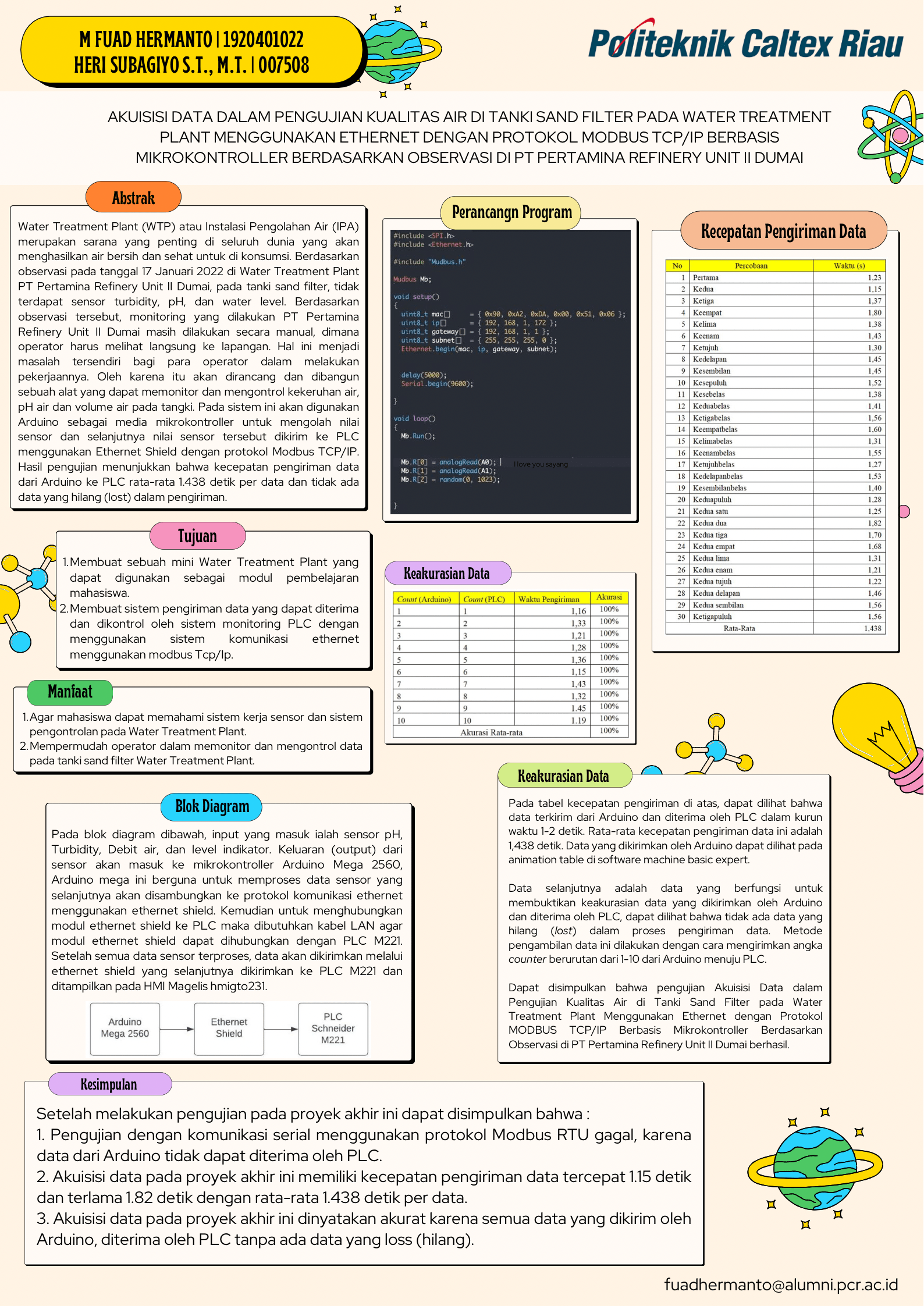 Akuisisi Data Dalam Pengujian Kualitas Air Di Tanki Sand Filter Pada Water Treatment Plant Menggunakan Ethernet Dengan Protokol Modbus TCP/IP Berbasis Mikrokontroller Berdasarkan Observasi di PT Pertamina Refinery Unit II Dumai