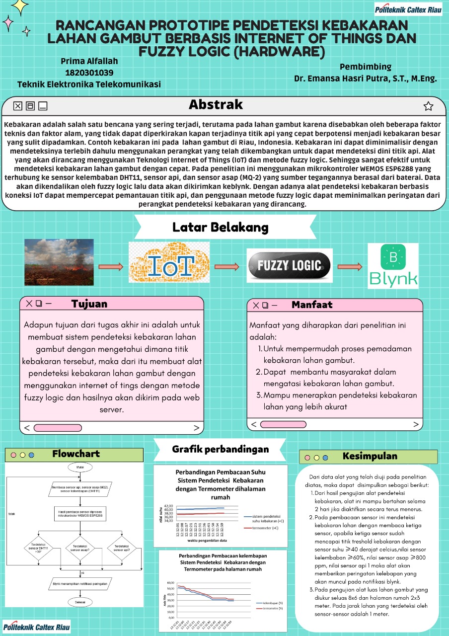 Kebakaran adalah salah satu bencana yang sering terjadi, terutama pada lahan gambut karena disebabkan oleh beberapa faktor teknis dan faktor alam, yang tidak dapat diperkirakan kapan terjadinya titik api yang cepat berpotensi menjadi kebakaran besar yang sulit dipadamkan. Contoh kebakaran ini pada lahan gambut di Riau, Indonesia. Kebakaran ini dapat diminimalisir dengan mendeteksinya terlebih dahulu menggunakan perangkat yang telah dikembangkan untuk dapat mendeteksi dini titik api. Alat yang akan dirancang menggunakan Teknologi Internet of Things (IoT) dan metode fuzzy logic. Sehingga sangat efektif untuk mendeteksi kebakaran lahan gambut dengan cepat. Pada penelitian ini menggunakan mikrokontroler WEMOS ESP6288 yang terhubung ke sensor kelembaban DHT11, sensor api, dan sensor asap (MQ-2) yang sumber tegangannya berasal dari baterai. Data akan dikendalikan oleh fuzzy logic lalu data akan dikirimkan keblynk. Dengan adanya alat pendeteksi kebakaran berbasis koneksi IoT dapat mempercepat pemantauan titik api, dan penggunaan metode fuzzy logic dapat meminimalkan peringatan dari perangkat pendeteksi kebakaran yang dirancang.